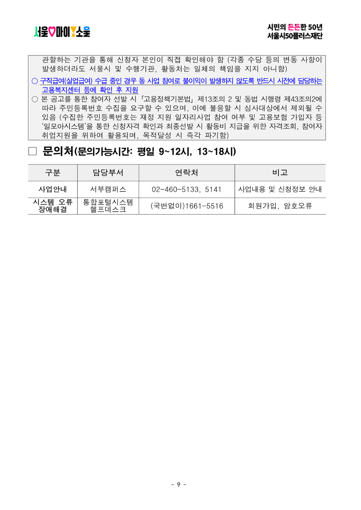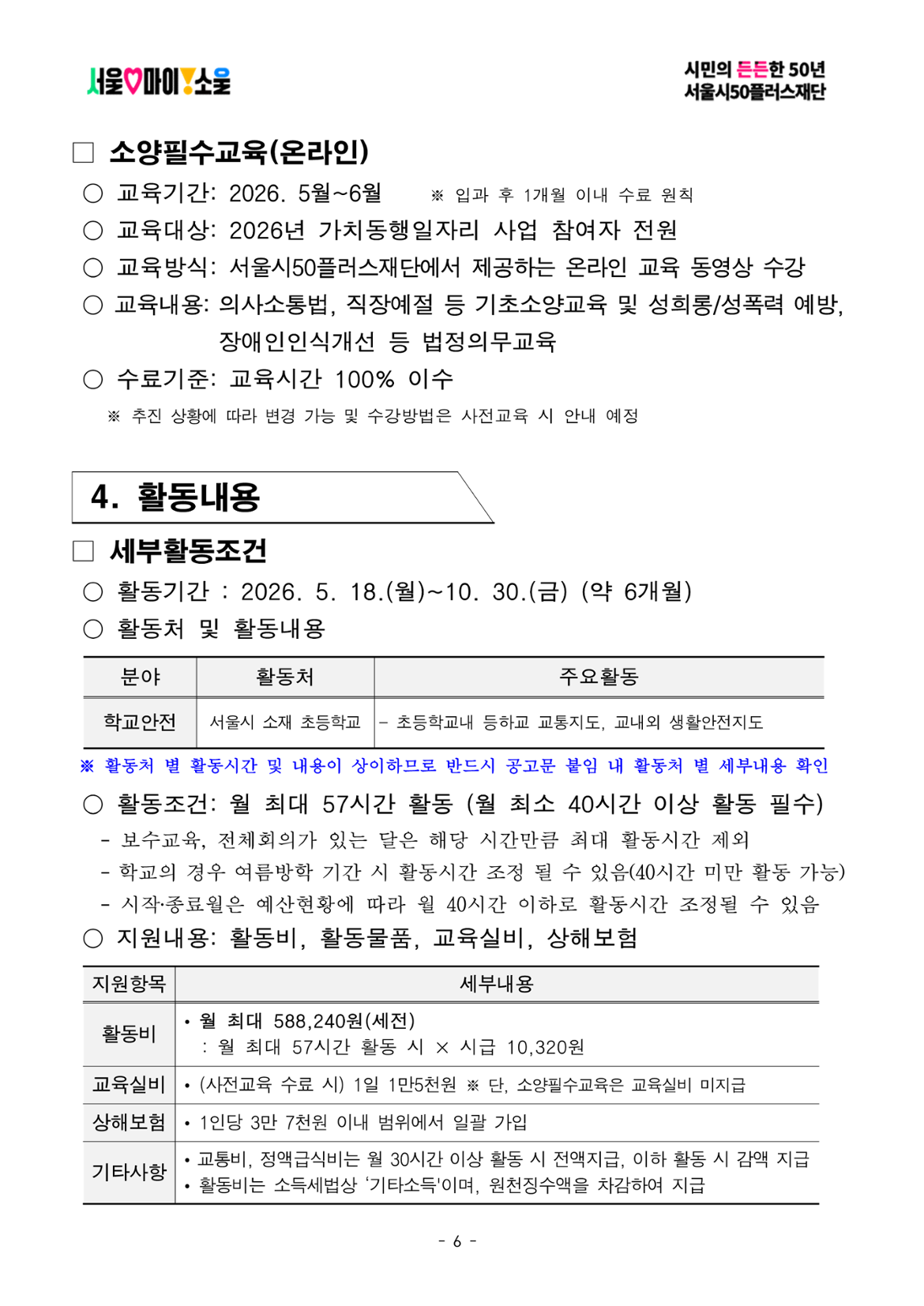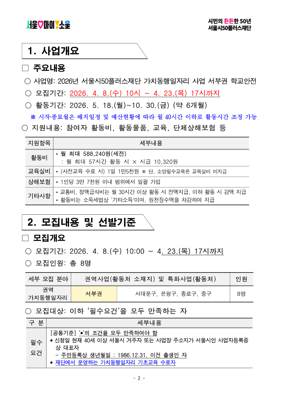 • 40세 이상(차상위 계층도 동일)인 자 중 주민등록상 서울시 거주자 또는 사업장 주소지가 서울시인 사업자등록증 상 대표자 • 월 활동시간(57시간) 중 70%(40시간)이상 활동이 가능한 자 • 모집공고 최종합격 후 참여자 사전교육 수료(90% 이상), 소양필수교육 수료(100%) 가능한 자 • 모집공고 마감일 전까지 재단에서 운영하는 가치동행일자리 기초교육 수료한 자