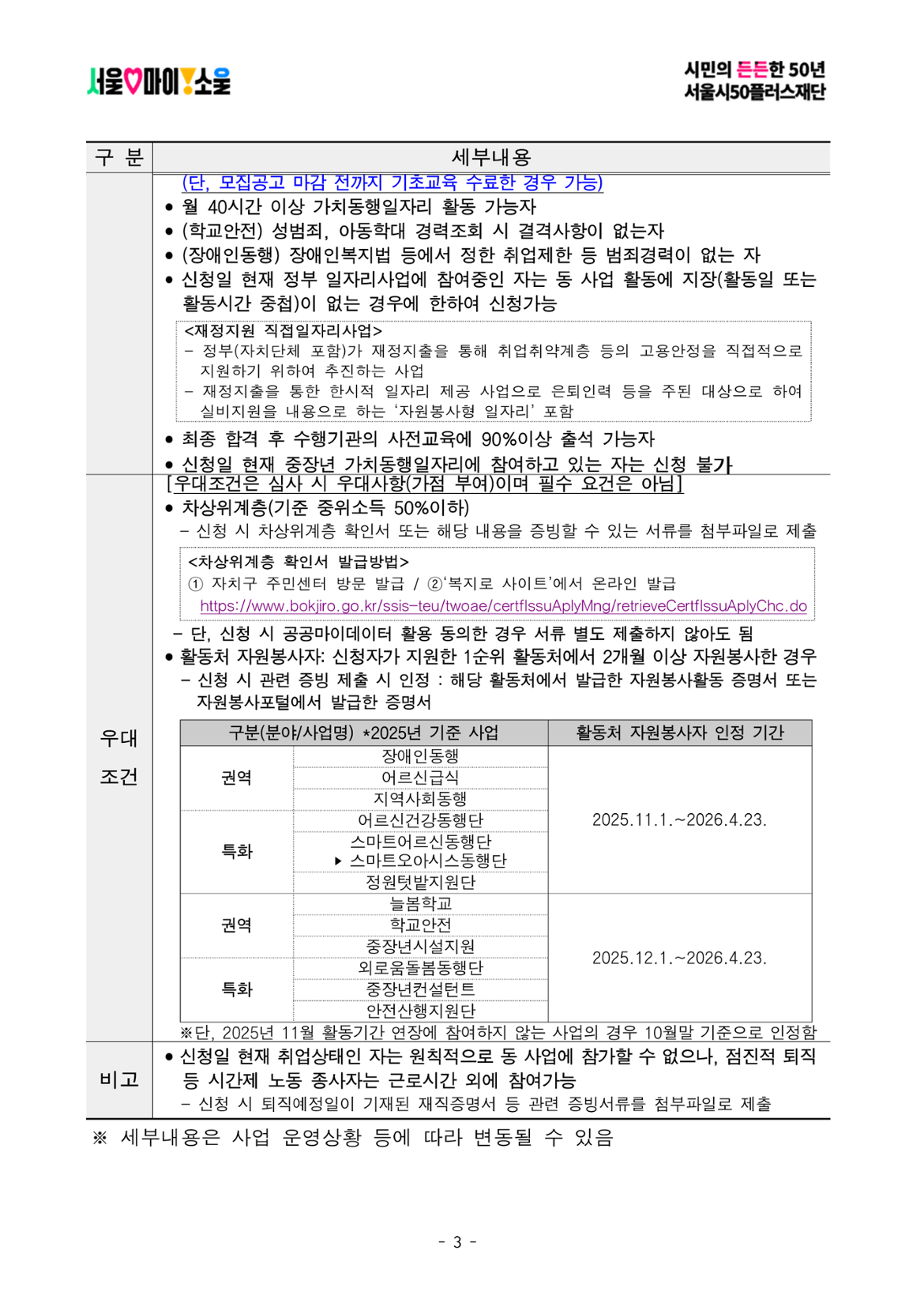 1. 신규 사업참여자 2. 활동처 자원봉사자: 신청자가 지원한 1순위 활동처에서 2025년 12월 1일~2026년 4월 23일 사이 2개월 이상 자원봉사 이력이 있는 자 3. 차상위계층(기준 중위소득 50%이하)인 자 ※ 1~3번 사항의 우대조건은 심사 시 우대사항이며, 필수요건은 아님 ※ 2~3번 사항은 온라인 신청 시 증빙서류 첨부 필수, 증빙서류 미첨부 시 가점 미부여