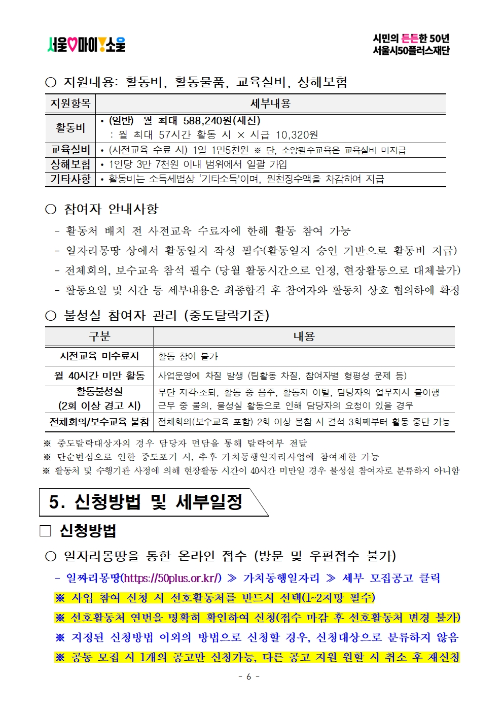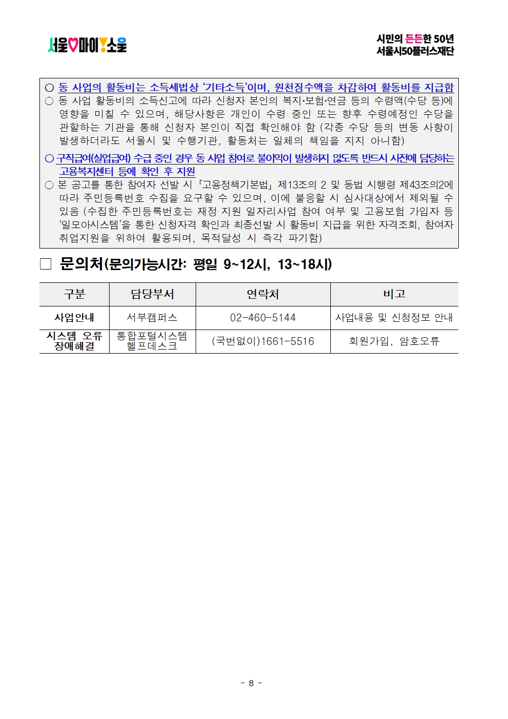 • 40세 이상(차상위 계층도 동일)인 자 중 주민등록상 서울시 거주자 또는 사업장 주소지가 서울시인 사업자등록증 상 대표자 • 월 활동시간(57시간) 중 70%(40시간)이상 활동이 가능한 자 • 모집공고 최종합격 후 참여자 사전교육 수료(90% 이상), 소양필수교육 수료(100%) 가능한 자 • 모집공고 마감일 전까지 재단에서 운영하는 가치동행일자리 기초교육 수료한 자