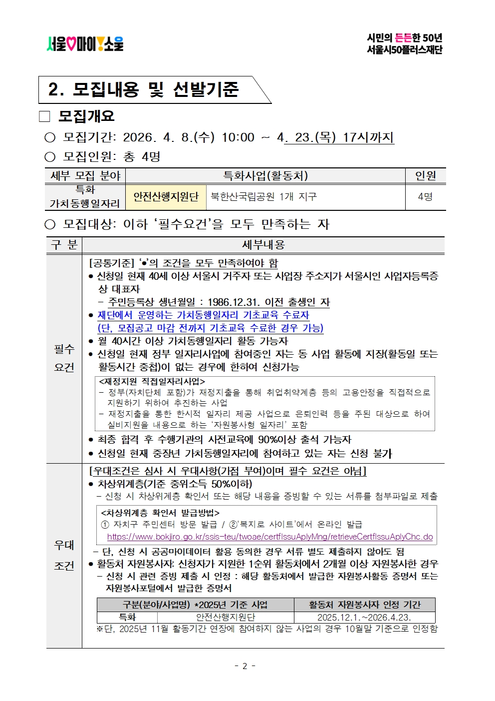 1) 신규 사업참여자 2) 활동처 자원봉사자: 신청자가 지원한 1순위 활동처에서 2025년 12월 1일~2026년 4월 23일 사이 2개월 이상 자원봉사 이력이 있는 자 3) 차상위계층(기준 중위소득 50%이하)인 자 4) 외국어 스피킹 가능자(영어, 중국어 등) ※ 1~4번 사항의 우대조건은 심사 시 우대사항이며, 필수요건은 아님 ※ 4번 사항은 외국인 탐방객 증가에 따라, 안전산행지원단 활동 시 안내 및 현장 대응을 고려하여 우대사항으로 적용 ※ 2~3번 사항은 온라인 신청 시 증빙서류 첨부 필수, 증빙서류 미첨부 시 가점 미부여