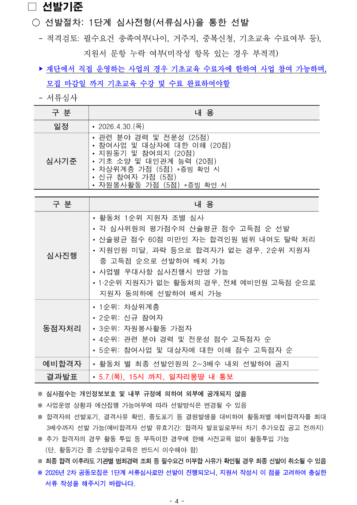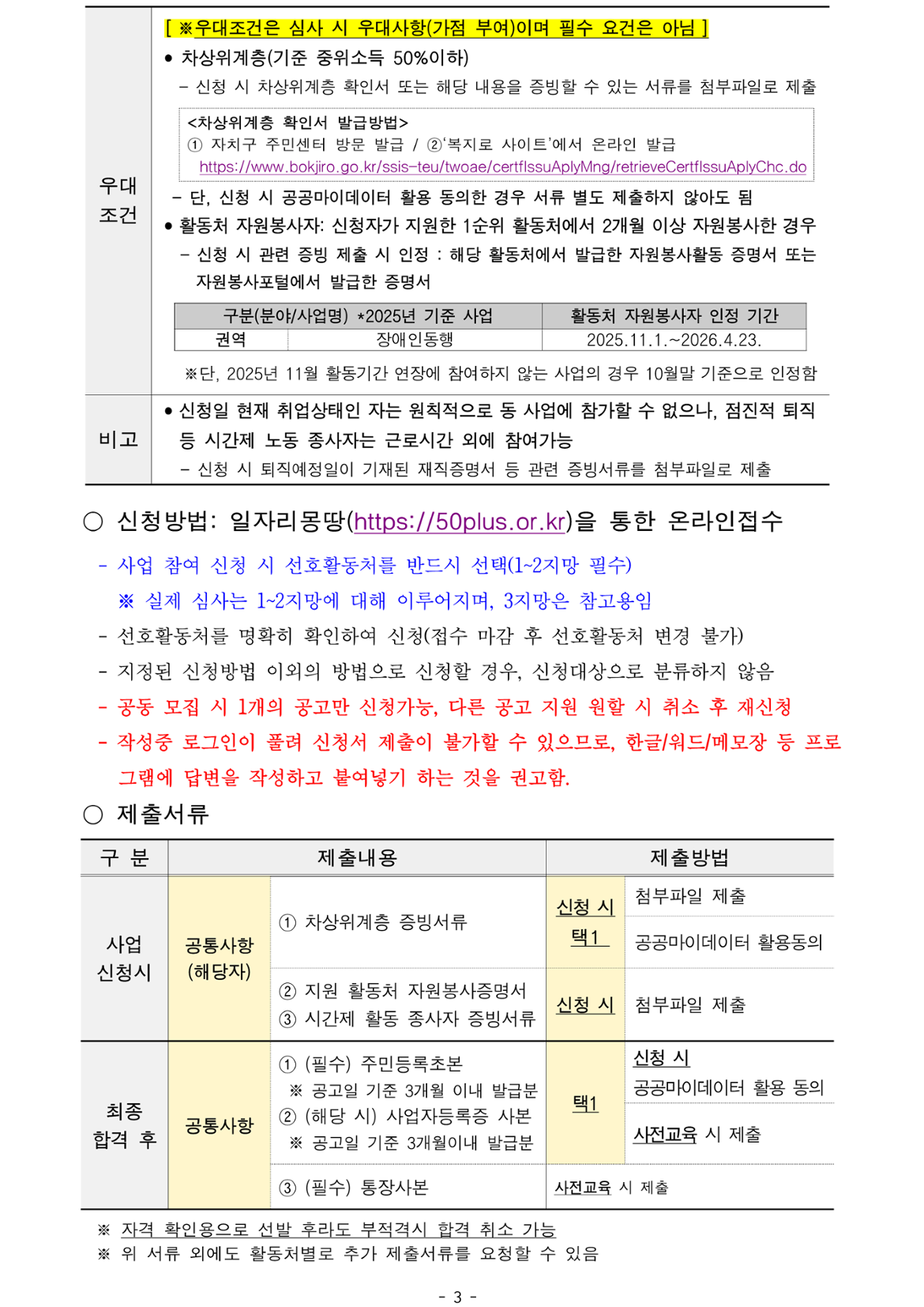 1) 신규 사업참여자 2) 활동처 자원봉사자: 신청자가 지원한 1순위 활동처에서 2025년 11월 1일~2026년 4월 23일 사이 2개월 이상 자원봉사 이력이 있는 자 3) 차상위계층(기준 중위소득 50%이하)인 자 ※ 1~3번 사항의 우대조건은 심사 시 우대사항이며, 필수요건은 아님 ※ 2~3번 사항은 온라인 신청 시 증빙서류 첨부 필수, 증빙서류 미첨부 시 가점 미부여