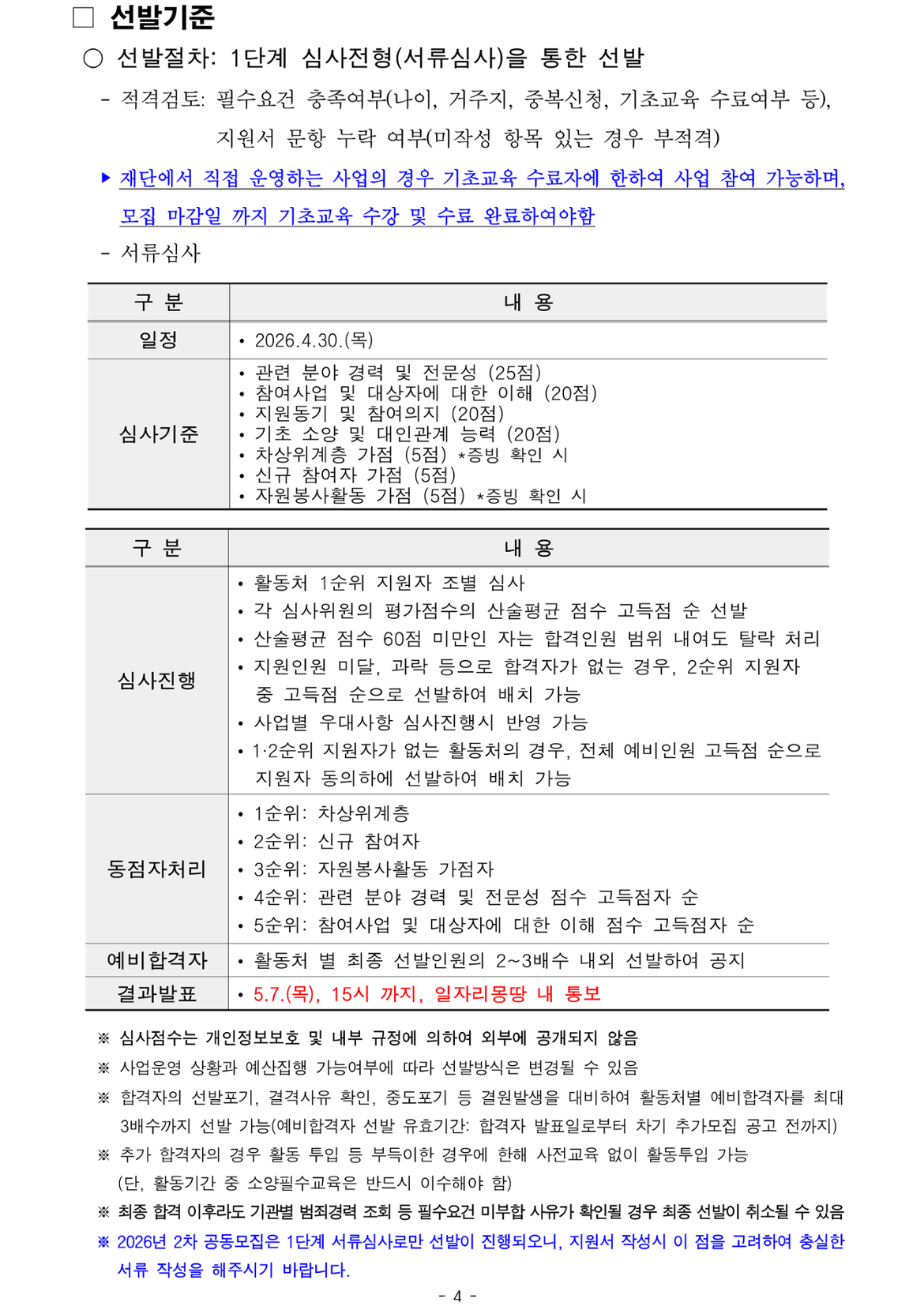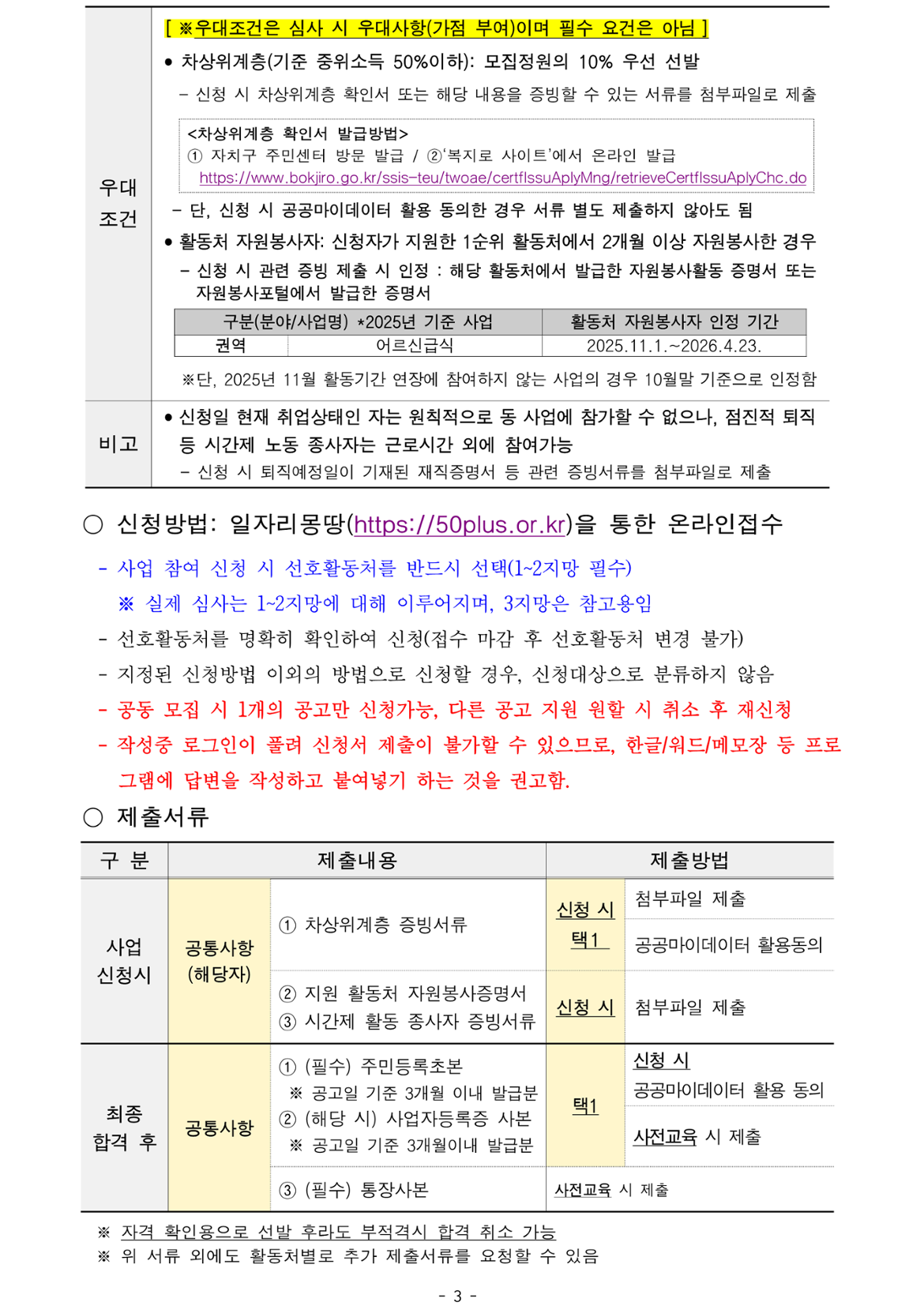 1) 신규 사업참여자 2) 활동처 자원봉사자: 신청자가 지원한 1순위 활동처에서 2025년 11월 1일~2026년 4월 23일 사이 2개월 이상 자원봉사 이력이 있는 자 3) 차상위계층(기준 중위소득 50%이하)인 자 ※ 1~3번 사항의 우대조건은 심사 시 우대사항이며, 필수요건은 아님 ※ 2~3번 사항은 온라인 신청 시 증빙서류 첨부 필수, 증빙서류 미첨부 시 가점 미부여