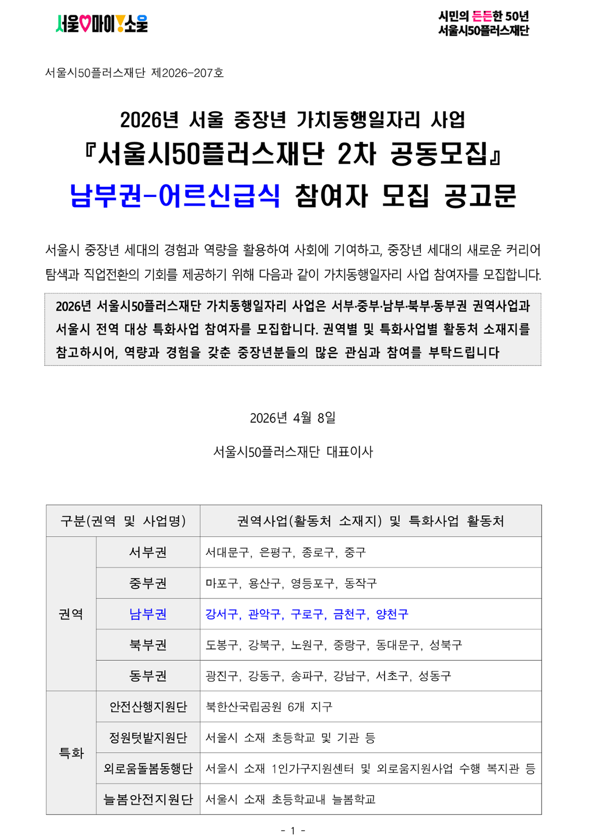 서울시50플러스재단 남부권 어르신급식(2차 공동모집)