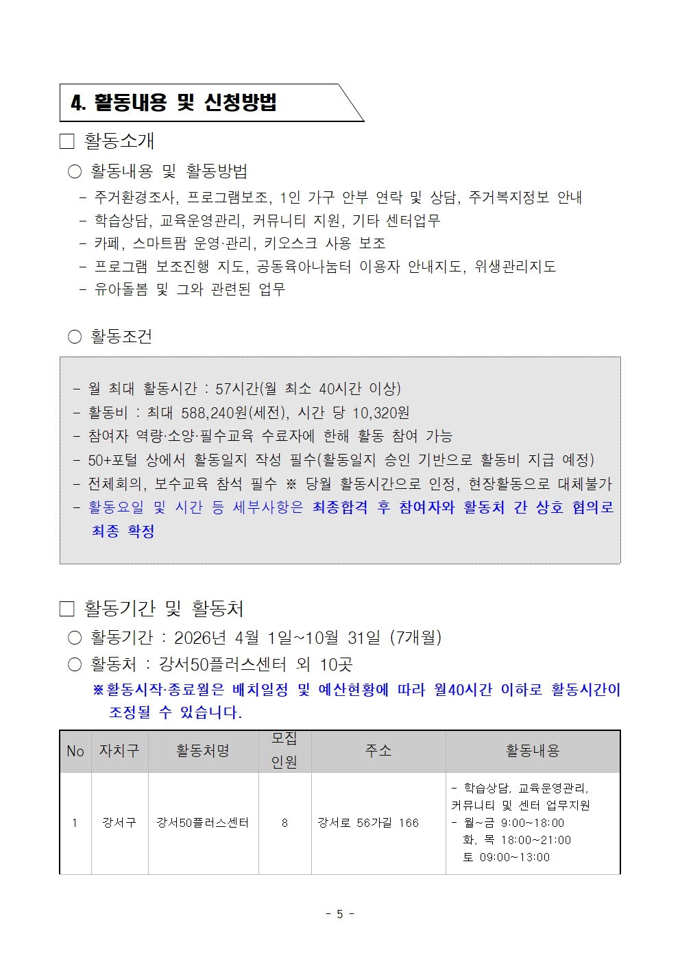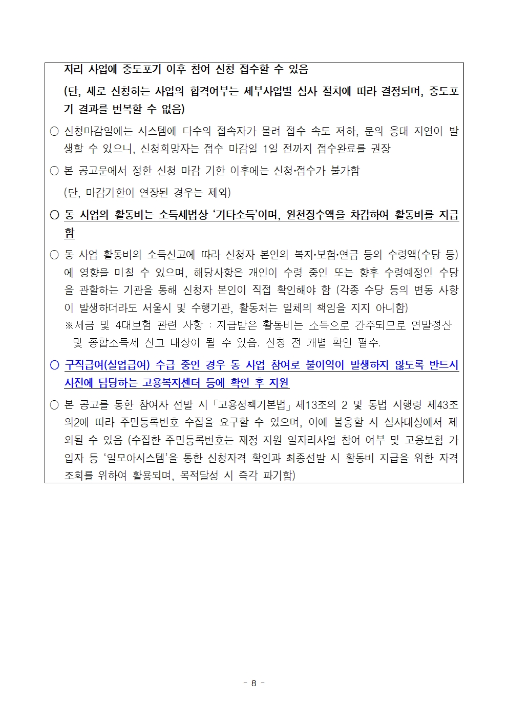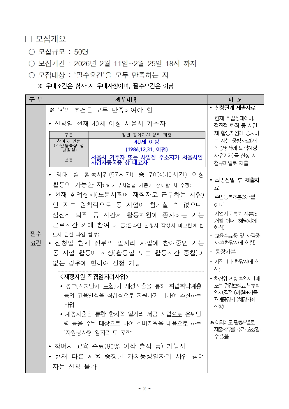 - 40세 이상(1986.12.31 이전 출생자)인 자 중 서울시 거주자(주민등록상) 또는 사업장 주소지가 서울시인 사업자등록증 상 대표자 - 월 활동시간(57시간) 중 70%(40시간)이상 활동이 가능한 자 - 참여자 역량교육 수료(90%이상), 소양교육 수료(100%) 가능한 자