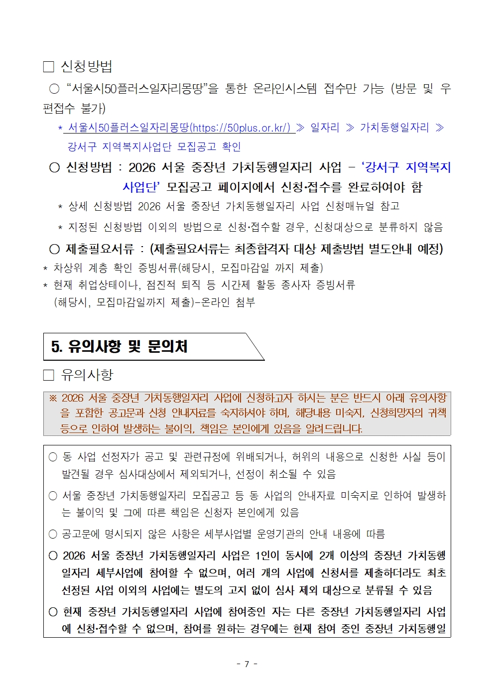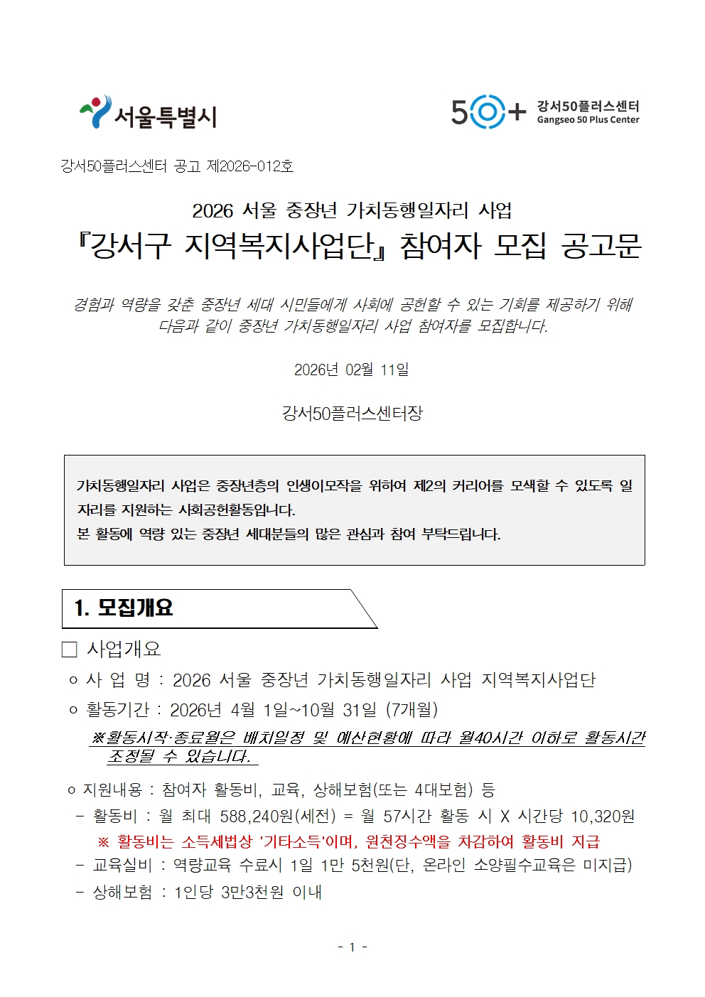 2026 서울 중장년 가치동행일자리 사업 '강서구 지역복지사업단' 참여자 모집마감 D-14