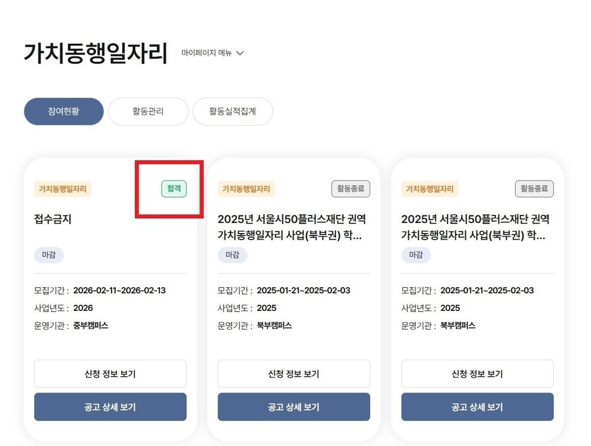 ○ 일자리몽땅 로그인>마이페이지>가치동행일자리>참여현황>'합격'/'탈락' 확인