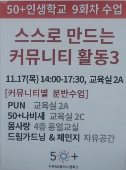 지난 11월 17일은 50+인생학교 과정의 핵심 목표 중 하나인 커뮤니티 결성이 마무리되는 뜻 깊은 날이었다. 앞서 소개된 바와 같이 커뮤니티 결성에는 결코 짧지 않은 총 3주간의 시간이 할애되었다. 회원들끼리 서로 머리를 맞대고 고심에 고심을 거듭한다는 소문이 자자했다. 강의실 입구에서부터 느껴지는 뜨거운 열기는 커뮤니티 탄생에 대한 기대를 더욱 부풀게 했다. ‘이탈리아 르네상스 시대의 화가 보티첼리가 명화 「비너스의 탄생」을 처음 구상했을 때의 느낌이 이렇지 않았을까?’ 라는 다소 민망한 상상을 하며 나도 몰래 번지는 입가의 미소를 슬며시 가렸다.