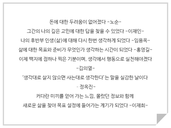 삶에 대한 주도적인 자세와 좋은 관계형성이 50플러스 인생에 매우 중요하다는 것을 다시 한번 느낄 수 있었던,