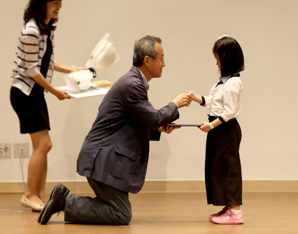 장려상을 받은 초등학생 눈높이에 맞추어 무릎을 꿇고 상을 주는 모습이네요.