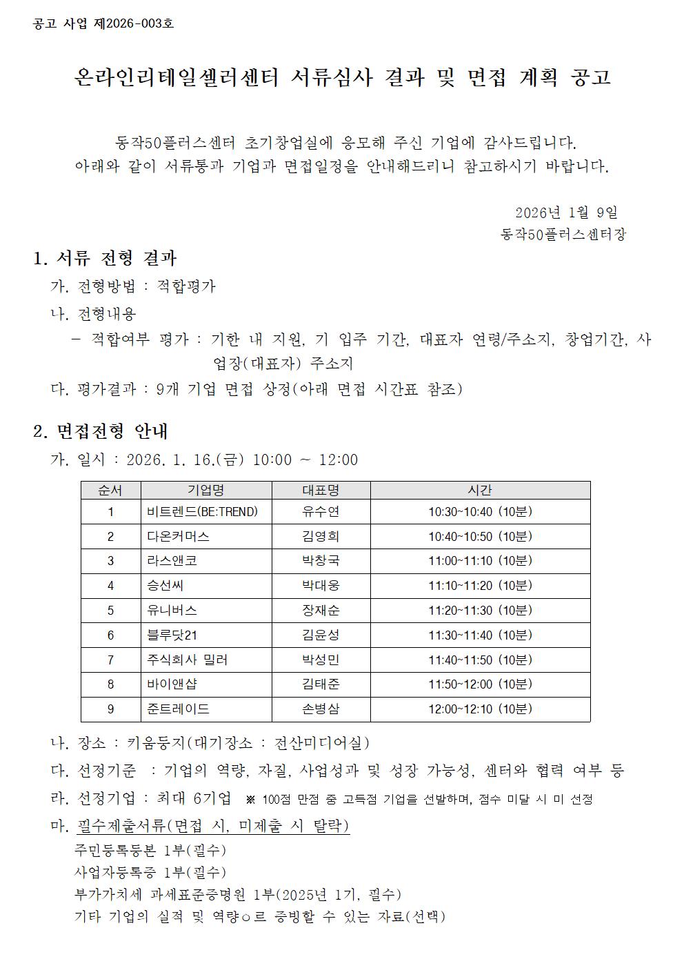 서울시 동작센터 | 온라인리테일셀러센터 서류심사 결과 및 면접 계획 공고