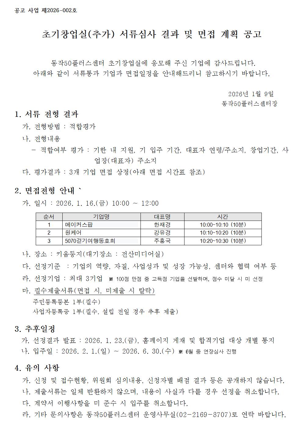 서울시 동작센터 | 초기창업실(추가) 서류심사 결과 및 면접 계획 공고