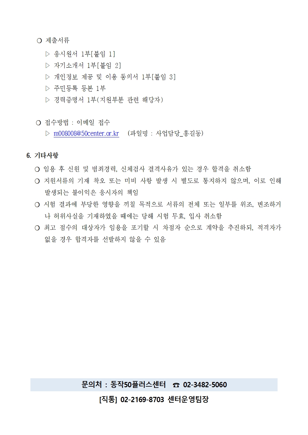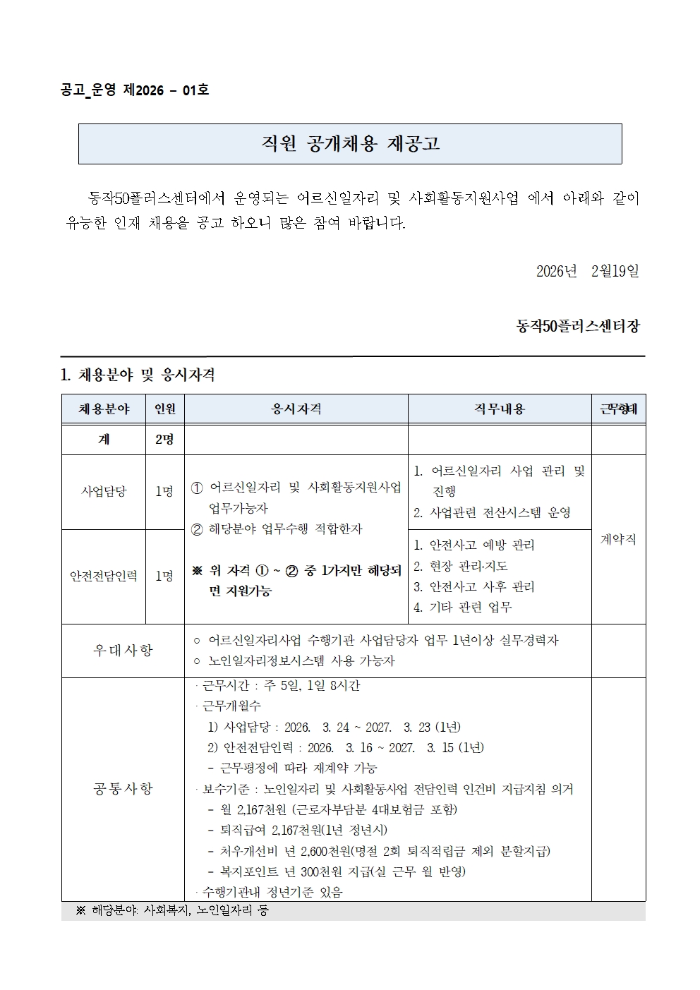서울시 동작센터 | 어르신일자리사업 사업담당자(사업담당 1명, 안전전담인력 1명) 채용 공고