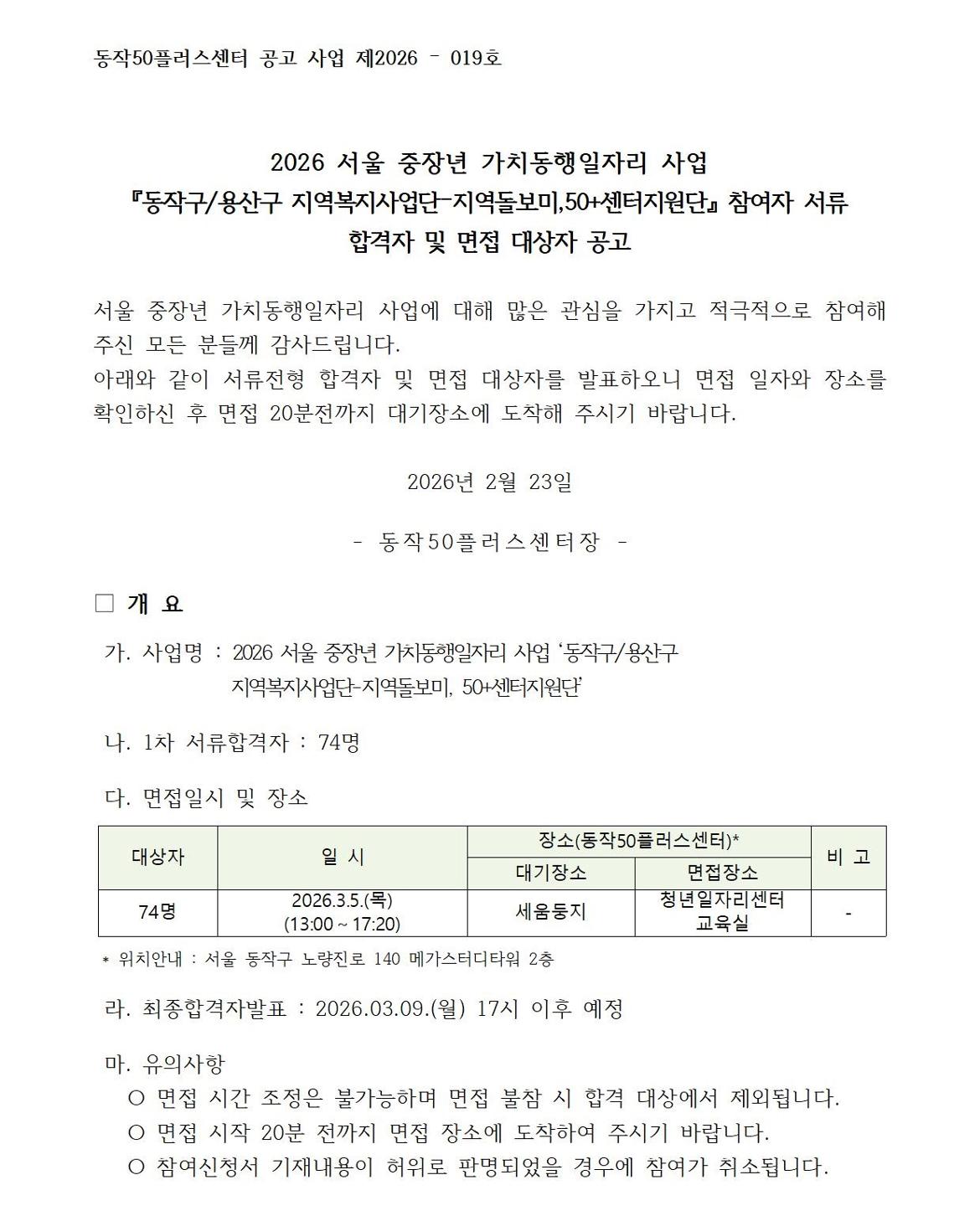 서울시 동작센터 | 2026년 동작구/용산구 지역복지사업단-지역돌보미,50+센터지원단 서류합격자 및 면접 대상자 공고
