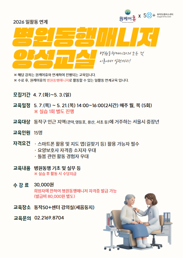 (2 회차) 2026.05.11(14:00 ~ 16:00) 1. 세움둥지 원케어휴 강사진 지역통합 돌봄과 병원동행의 이해 스마트폰, 필기도구 등