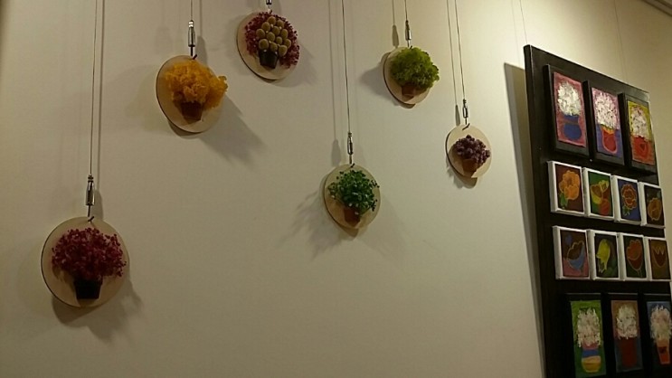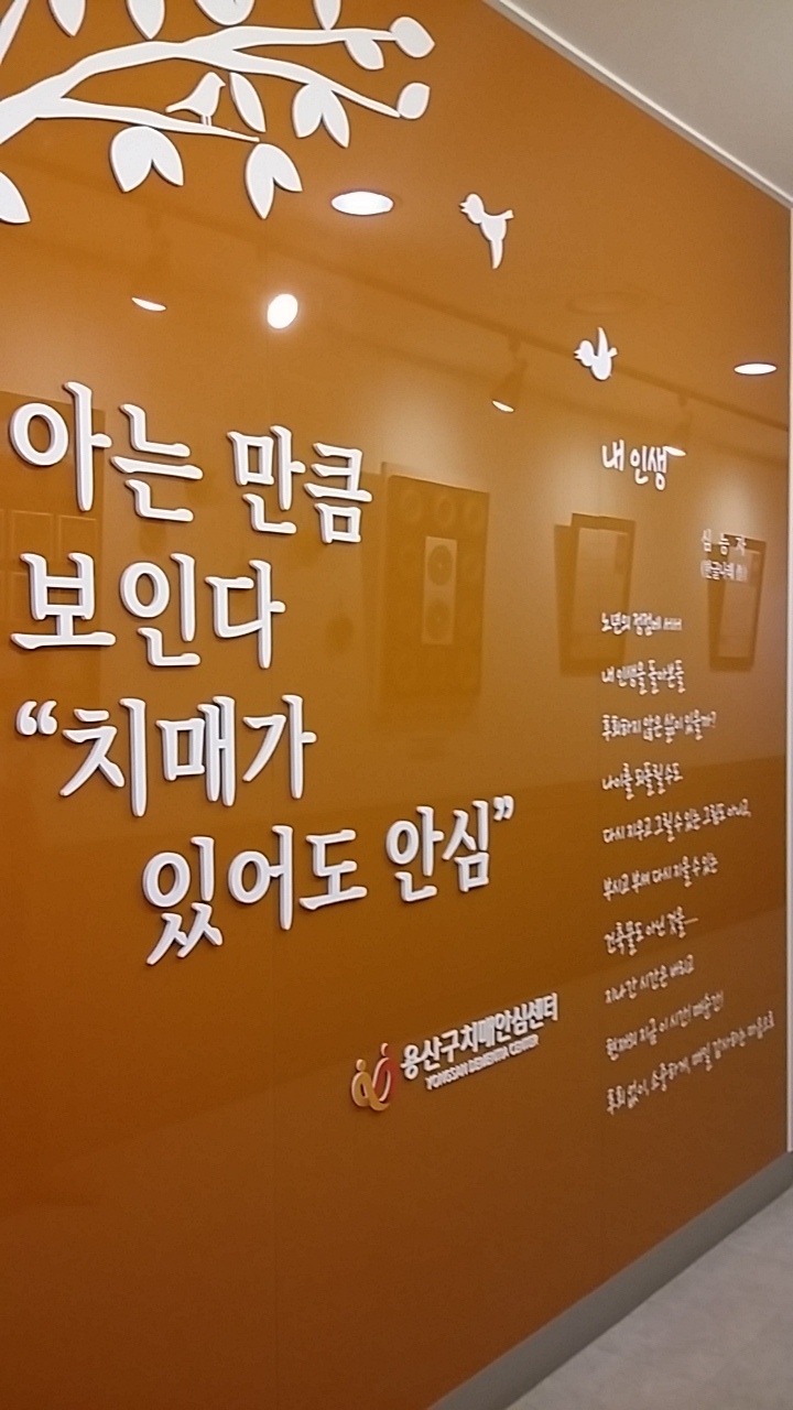 키 큰 초록의 연밥이 놓인 청결한 카페를 나와 복도를 둘러본다. 용산구 치매안심센터를 이용하는 분들 작품이 예쁘게 단장되어 걸려있다. “아는 만큼 보인다. 치매가 있어도 안심" 역시 공부가 최고다.