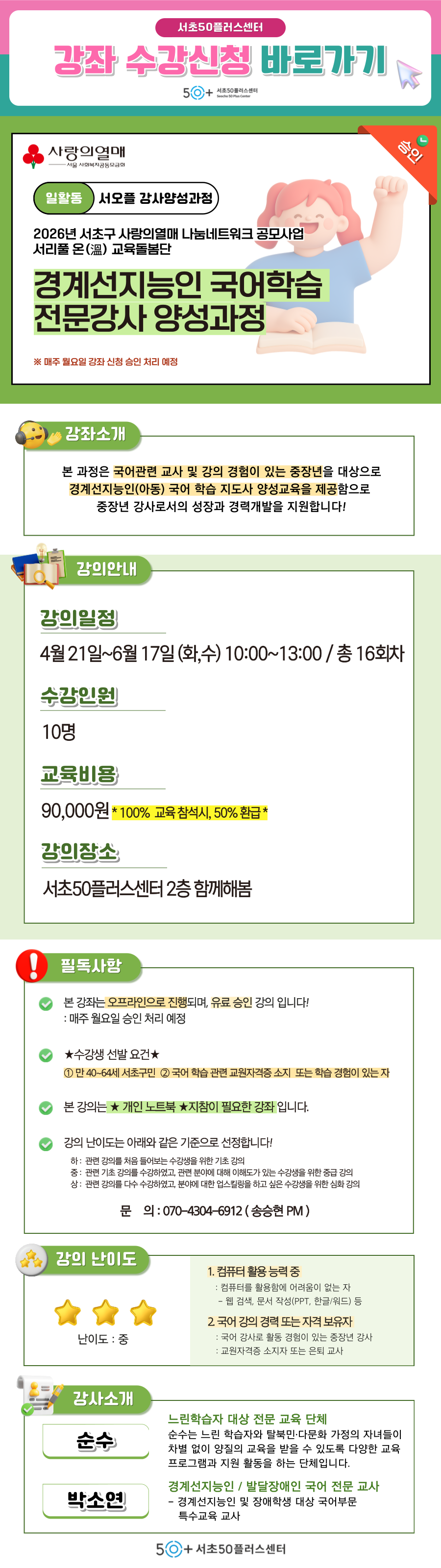[서초][서초구 사랑의열매 나눔네트워크 '서리풀 온(溫) 교육돌봄단'] 경계선지능인 국어학습  전문강사 양성과정마감 D-10