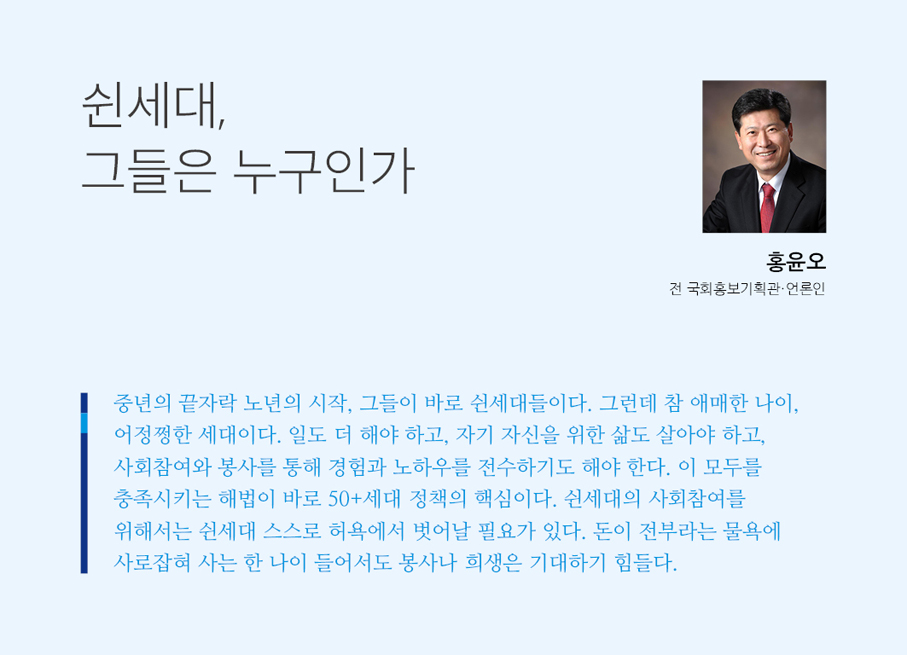 중년의 끝자락 노년의 시작, 그들이 바로 쉰세대들이다. 그런데 참 애매한 나이, 어정쩡한 세대이다. 일도 더 해야 하고, 자기 자신을 위한 삶도 살아야 하고, 사회참여와 봉사를 통해 경험과 노하우를 전수하기도 해야 한다. 이 모두를 충족시키는 해법이 바로 50+세대 정책의 핵심이다. 쉰세대의 사회참여를 위해서는 쉰세대 스스로 허욕에서 벗어날 필요가 있다. 돈이 전부라는 물욕에 사로잡혀 사는 한 나이 들어서도 봉사나 희생은 기대하기 힘들다.