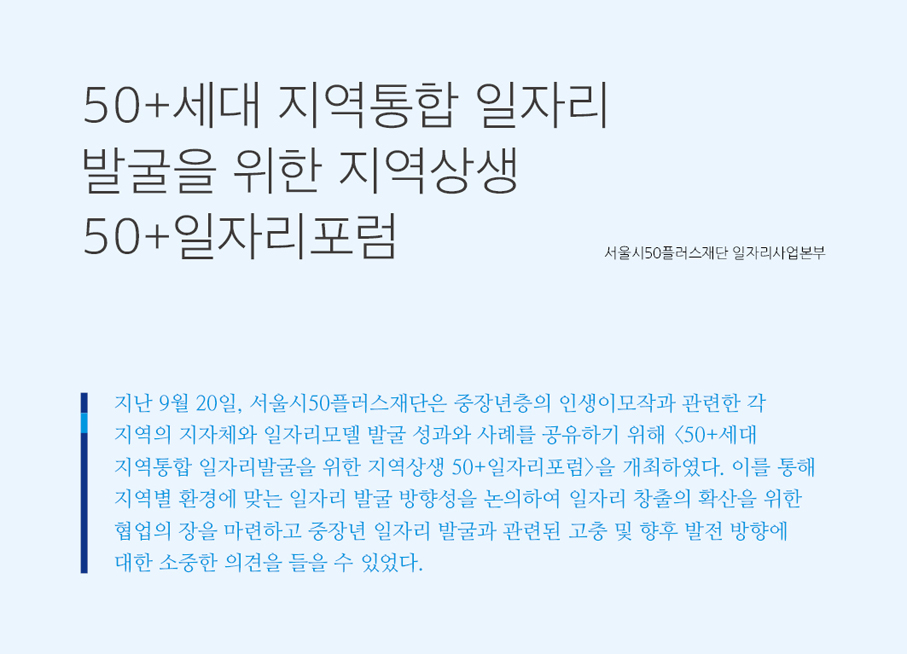 지난 9월 20일, 서울시50플러스재단은 중장년층의 인생이모작과 관련한 각 지역의 지자체와 일자리모델 발굴 성과와 사례를 공유하기 위해 <50+세대 지역통합 일자리발굴을 위한 지역상생 50+일자리포럼>을 개최하였다. 이를 통해 지역별 환경에 맞는 일자리 발굴 방향성을 논의하여 일자리 창출의 확산을 위한 협업의 장을 마련하고 중장년 일자리 발굴과 관련된 고충 및 향후 발전 방향에 대한 소중한 의견을 들을 수 있었다.