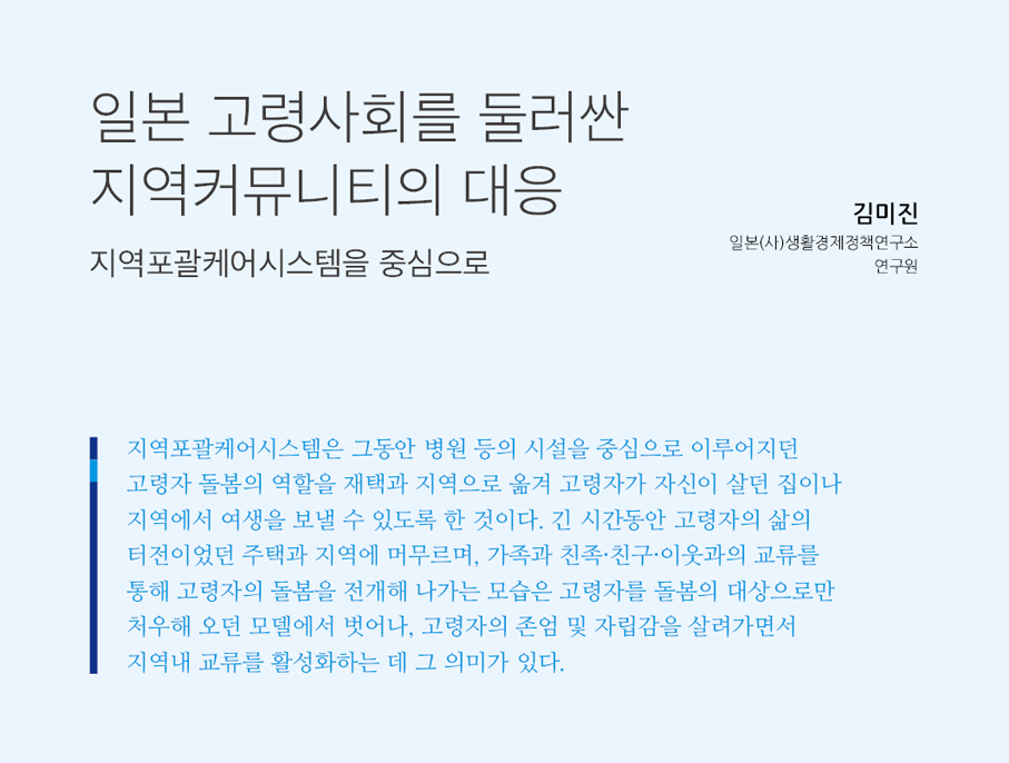 이러한 상황에서 주목받고 있는 것이 지역의 커뮤니티를 중심으로 한 대응전략이다. 일본 정부는 최근에 개정한 고령사회대책대강에서도 ‘(국민이 생애에 걸쳐) 건강하고 충실한 생활을 누릴 수 있는 풍요로운 사회’와 함께 ‘(국민이 생애에 걸쳐) 사회를 구성하는 중요한 일원으로 존중되고 지역사회가 자립과 연대의 정신에 입각하여 형성된 사회’를 이념으로 제시하면서 지역사회의 중요성을 강조하였다. 고령사회대책대강에서는 이러한 사회를 지향하는 방편으로 ‘지역포괄케어시스템’의 확립을 강조하고 있는데, 이는 서로 돕고 사는 상부상조로 지역 안에서의 결합을 강화하고 일상생활의 권역 내에서 의료·개호·예방 등의 생활 지원 서비스가 단절 없이 유기적이고 통합적으로 제공되는 것을 의미한다.
