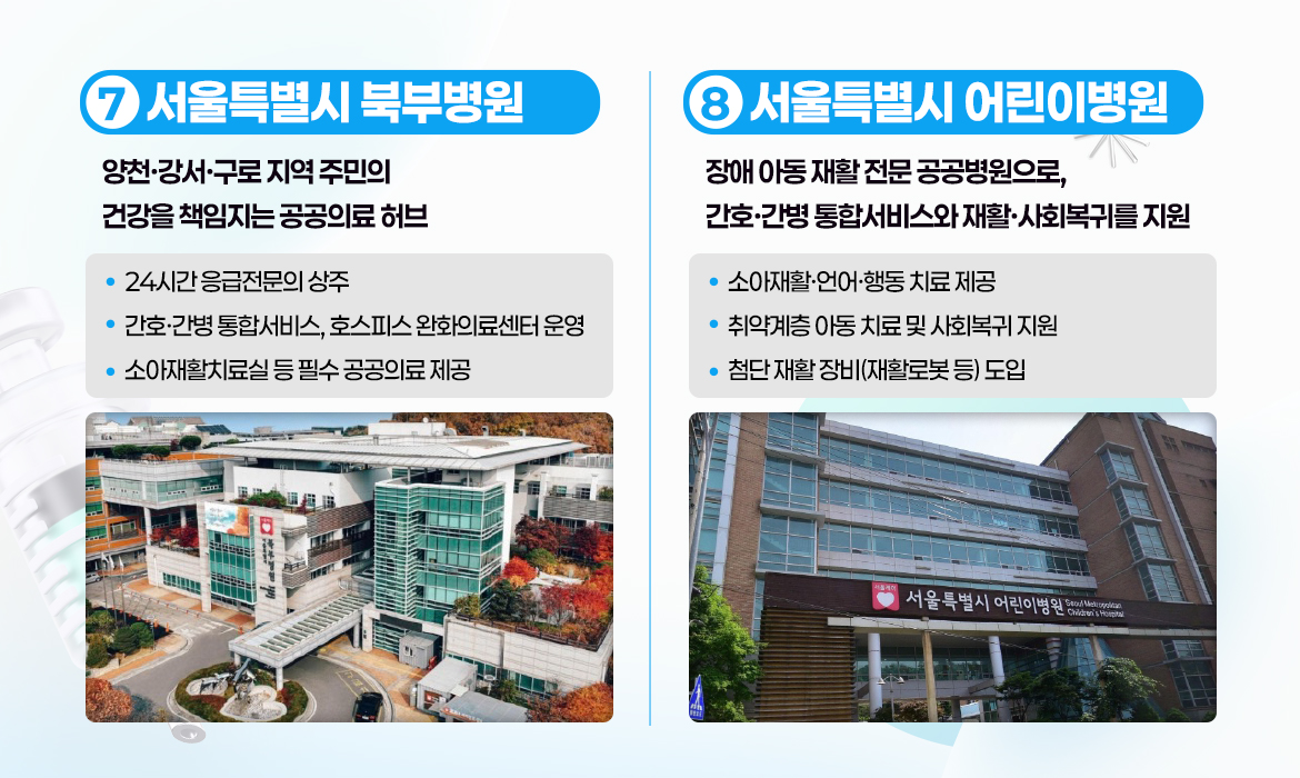 다음은 북부병원과 어린이병원입니다북부병원은 응급·재활·호스피스 등 지역 공공의료의 중심 역할을 하며, 어린이병원은 국내 유일 장애 아동 재활 전문 공공병원으로 재활·간호·사회복귀까지 체계적으로 지원합니다.