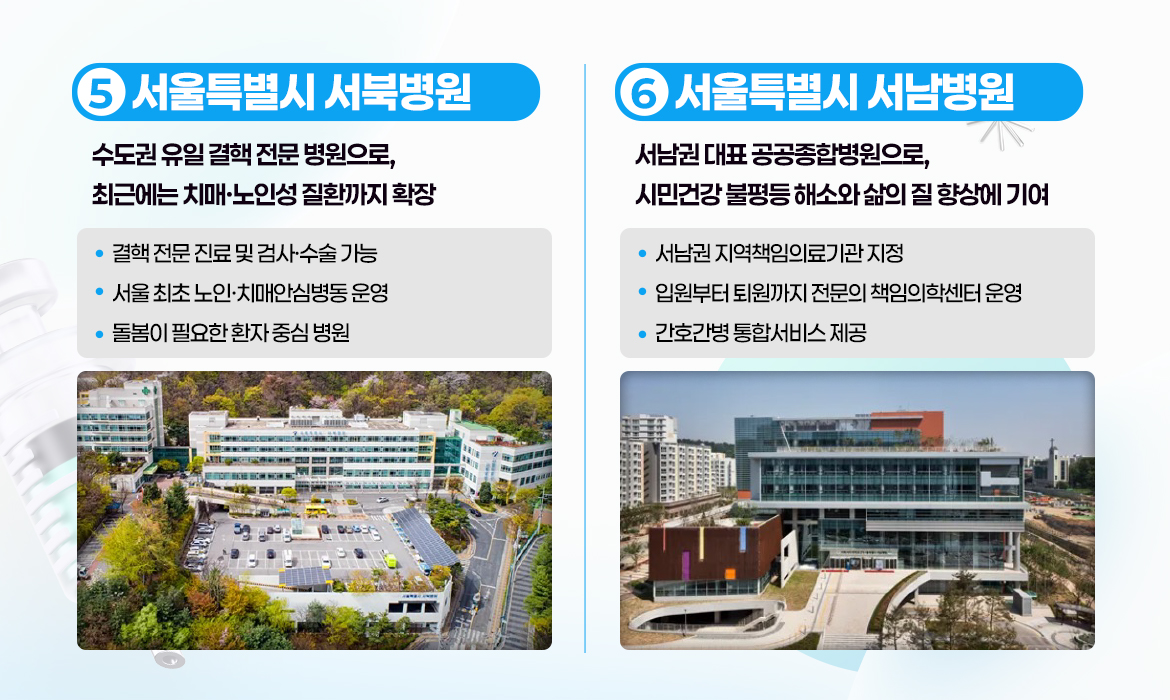 다음은 서북병원과 서남병원을 소개합니다서북병원은 수도권 유일의 결핵 전문 공공병원으로 치매·노인성 질환까지 치료하며, 서남병원은 서남권 대표 공공종합병원으로 입원부터 퇴원까지 전문 의료 서비스를 제공합니다.