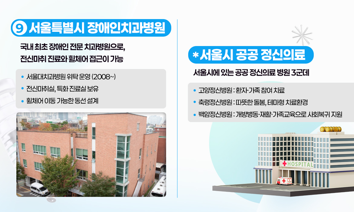 마지막으로 장애인치과병원과 공공 정신의료 3곳을 소개합니다. 장애인치과병원은 국내 최초 장애인 전문 치과병원으로 휠체어 접근과 전신마취 진료가 가능하며, 공공 정신병원 3(고양·축령·백암)은 재활·가족교육·테마형 치료 환경으로 환자의 사회복귀를 지원합니다.