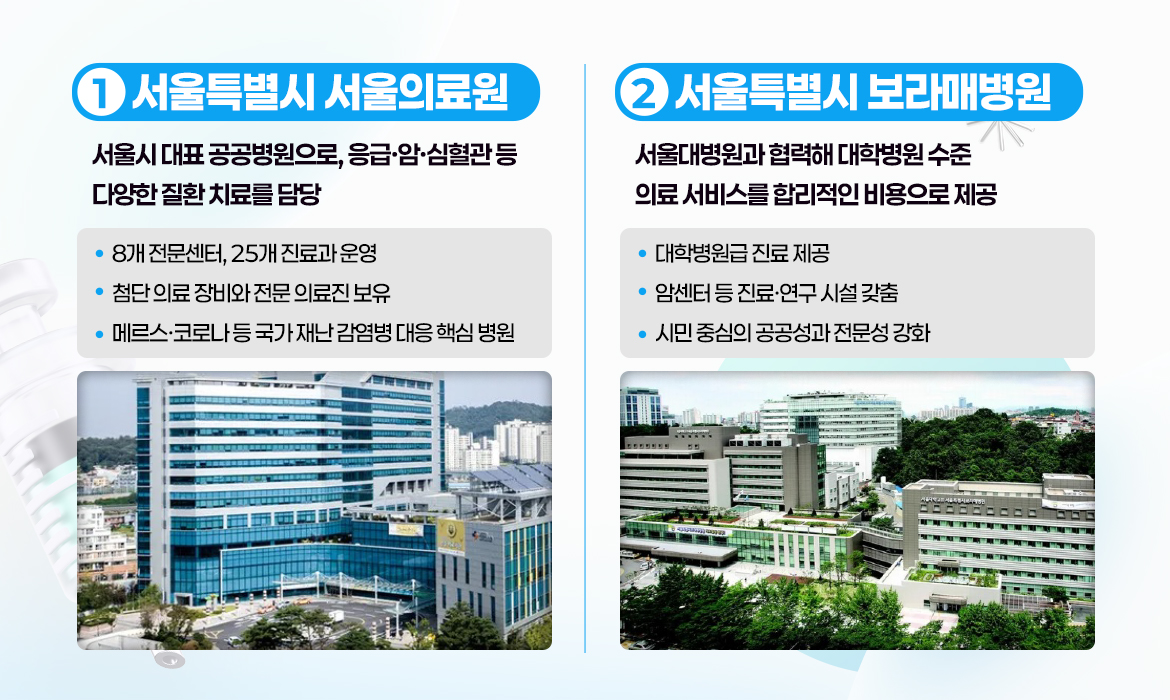 서울시 대표 공공병원인 서울의료원과 보라매병원을 소개합니다서울의료원은 응급··심혈관 등 다양한 질환 치료를, 보라매병원은 대학병원 수준의 전문 진료를 합리적인 비용으로 제공합니다.