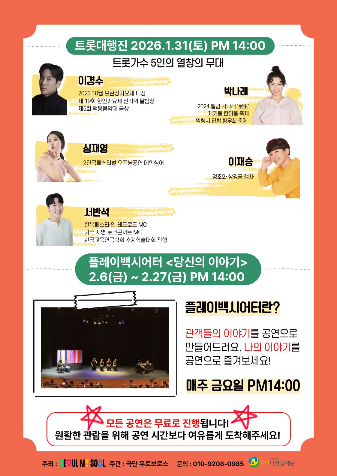 ▶ 공연: 트롯대행진(매주 토), 플레이백시어터(매주 금)