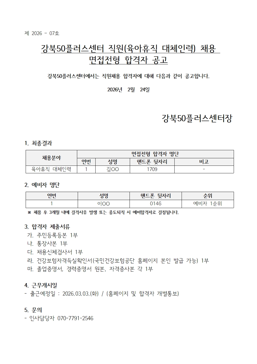 [제2026-007호] 2026년 강북50플러스센터 직원(육아휴직대체인력) 면접전형 최종 합격자 공고