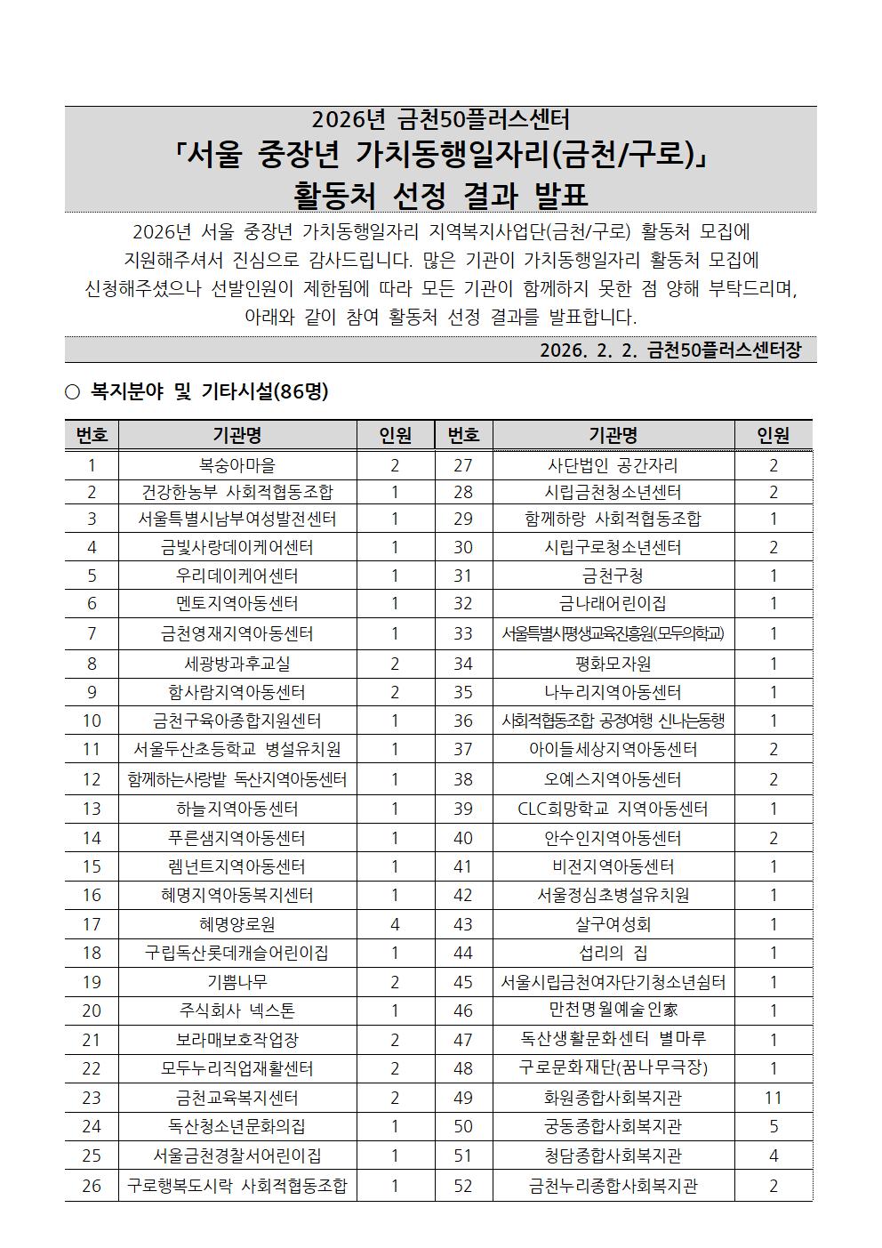 서울시 금천센터 | [공고]2026년 서울 중장년 가치동행일자리(금천/구로) 활동처 선정 결과 발표