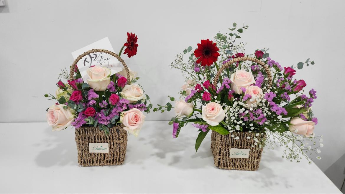 한 송이씩 정성껏 꽂다 보니 어느새 탐스러운 반구형 꽃바구니가 완성됐어요. 꽃을 만지는 내내 "꽃 한 송이 한 송이를 만지며 나를 위한 소중한 시간이었다"고 하실 만큼, 작은 꽃잎 하나하나에 집중하는 시간이 참 특별했습니다.
