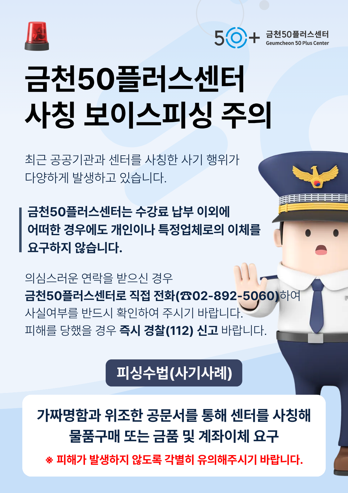의심스러운 연락을 받으신 경우, 금천50플러스센터로 직접 전화(02-892-5060)하여 사실여부를 반드시 확인하여 주시기 바랍니다.