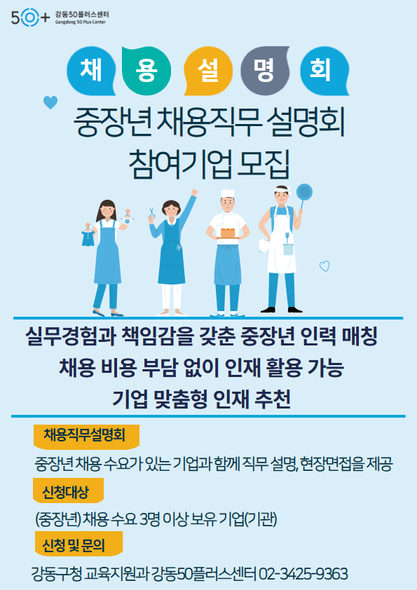 중장년 세대를 채용할 수요가 있으며강동50플러스센터에서 채용설명회를 진행하고자 하는 기업/기관을 모집하오니