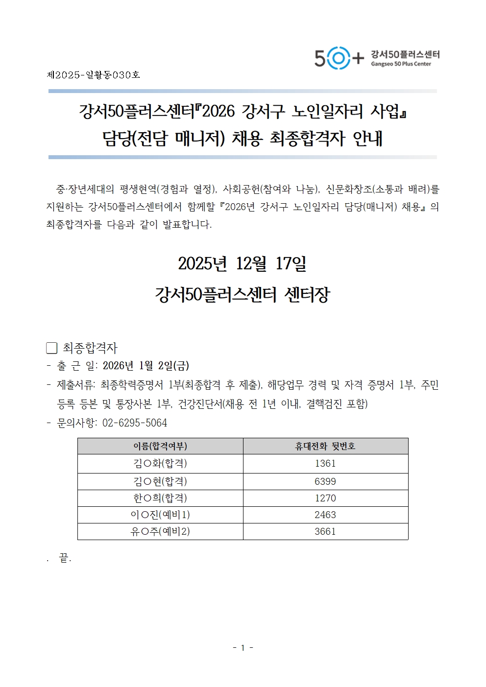 서울시 강서센터 | 강서50플러스센터 『2026 강서구 노인일자리 사업』 담당(전담 매니저) 채용 최종합격자 발표