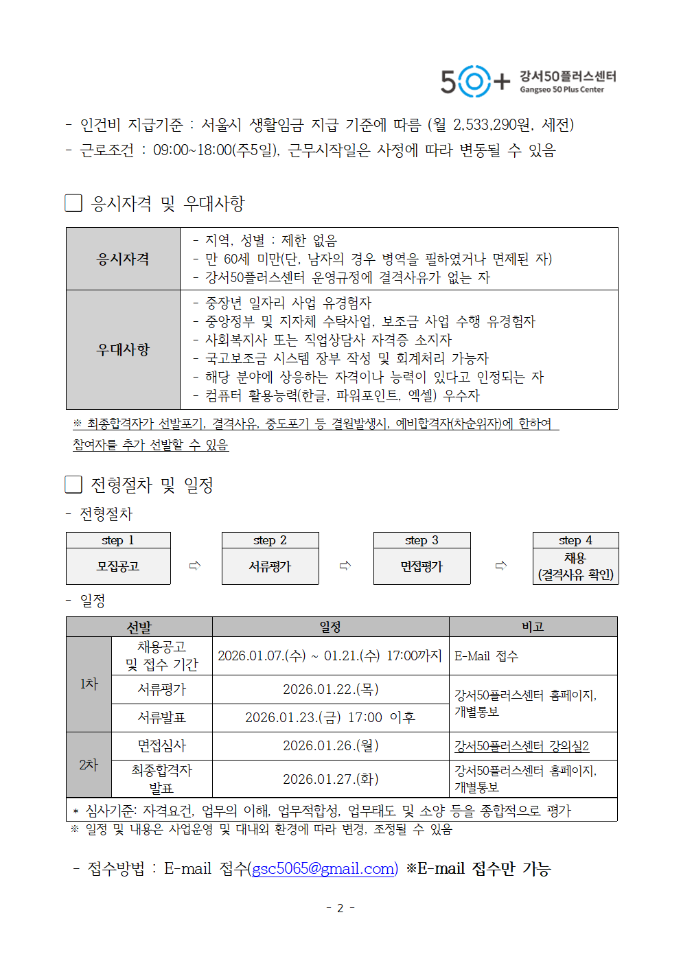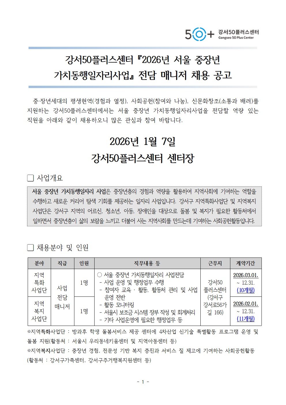 서울시 강서센터 | 2026년 서울 중장년 가치동행일자리사업 전담 매니저(강서구 지역특화/지역복지 사업단) 채용 공고