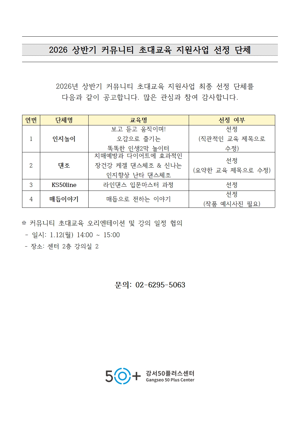 서울시 강서센터 | 2026년 상반기 커뮤니티 지원사업(초대교육) 선정 안내