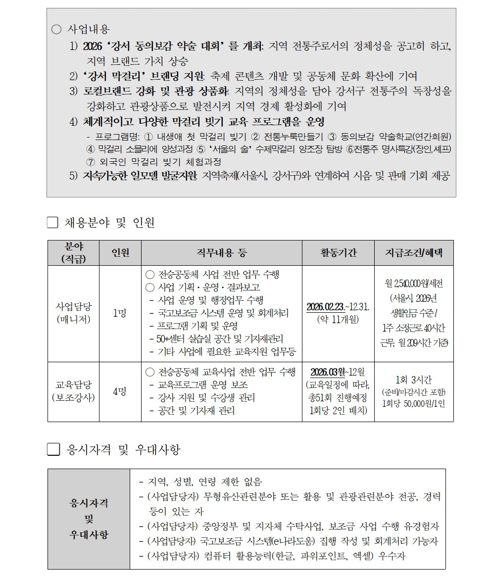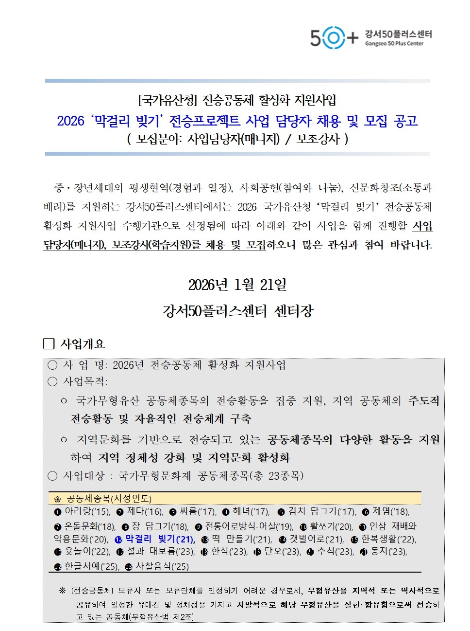 서울시 강서센터 | 2026 국가유산청 전승공동체 활성화지원 사업 담당자 채용 및 모집 공고 (사업담당자(매니저)/보조강사)