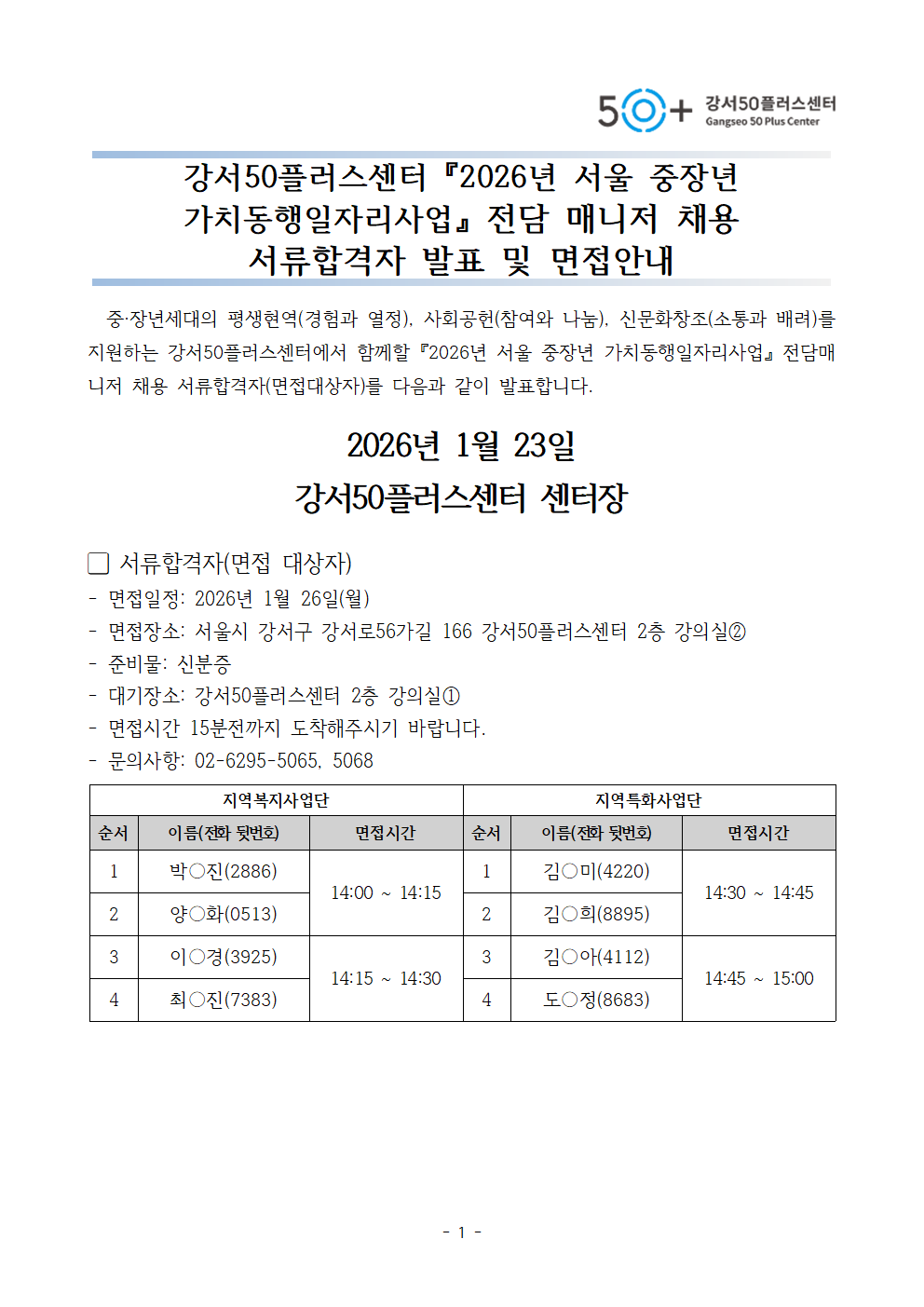 서울시 강서센터 | 2026년 서울 중장년 가치동행일자리사업 전담 매니저 채용 서류합격자 발표 및 면접 안내