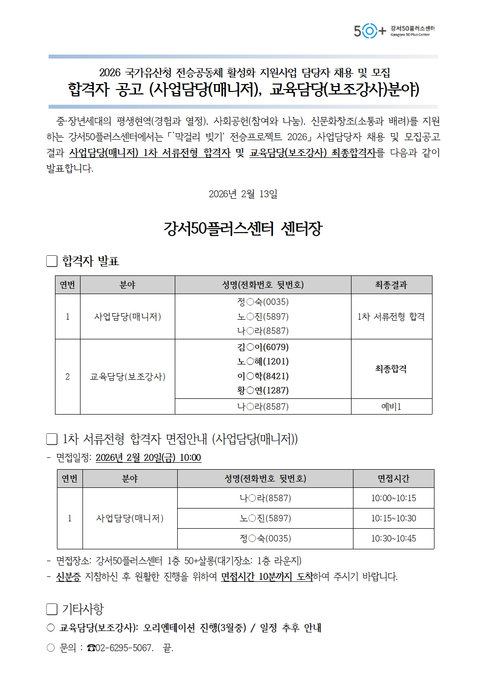 강서50플러스센터, 기업연계 일자리, 합격자공고