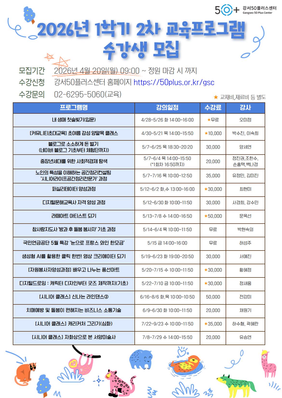 [강서50플러스센터] 2026년 1학기 2차 교육프로그램 수강생 모집 (4/20~ 정원 마감시까지)