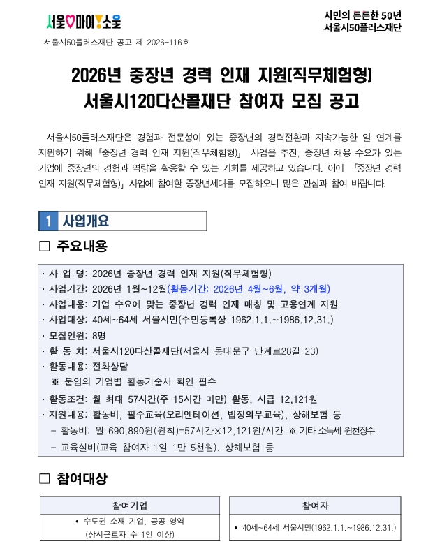 [북부] 중장년 경력 인재 지원(직무체험형) 참여자 모집(서울시120다산콜재단)마감 D-6