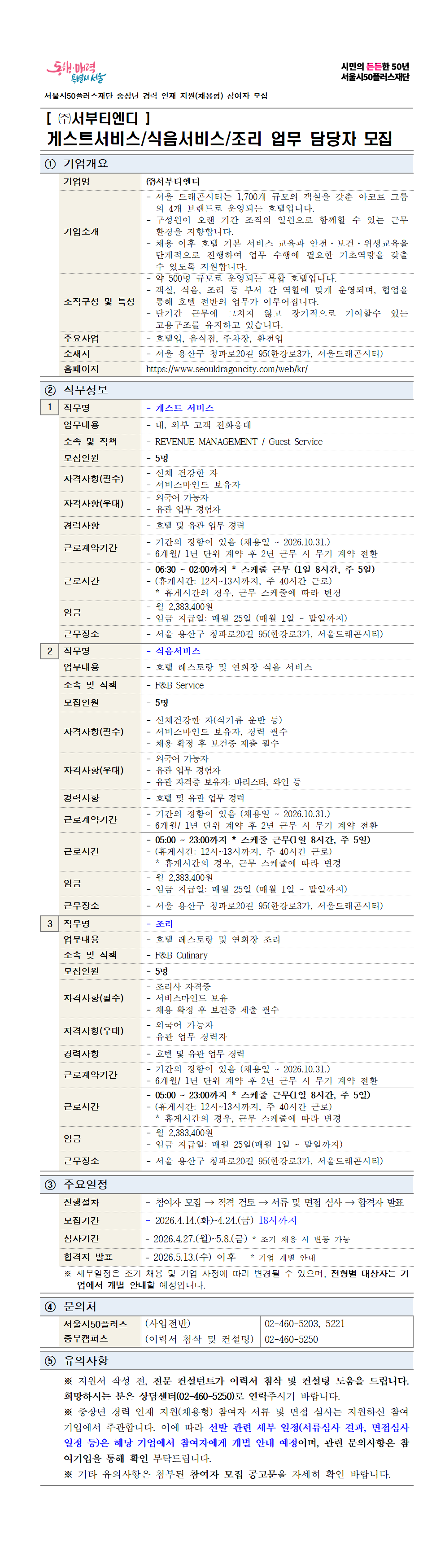 - 채용 이후 호텔 기본 서비스 교육과 안전·보건·위생교육을 단계적으로 진행하여 업무 수행에 필요한 기초역량을 갖출 수 있도록 지원합니다.
