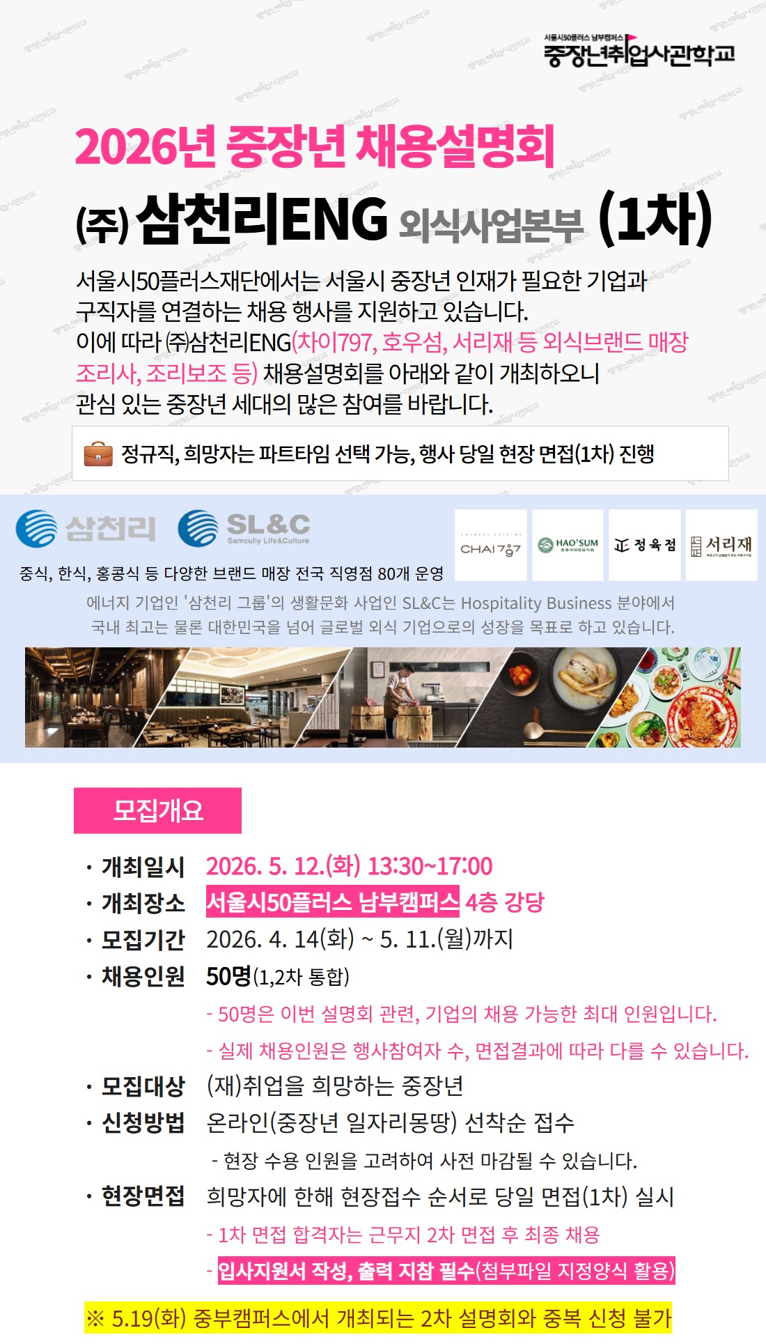 정규직 50명. 외식사업본부 브랜드 매장 직원 채용을 위한 설명회를 개최합니다.