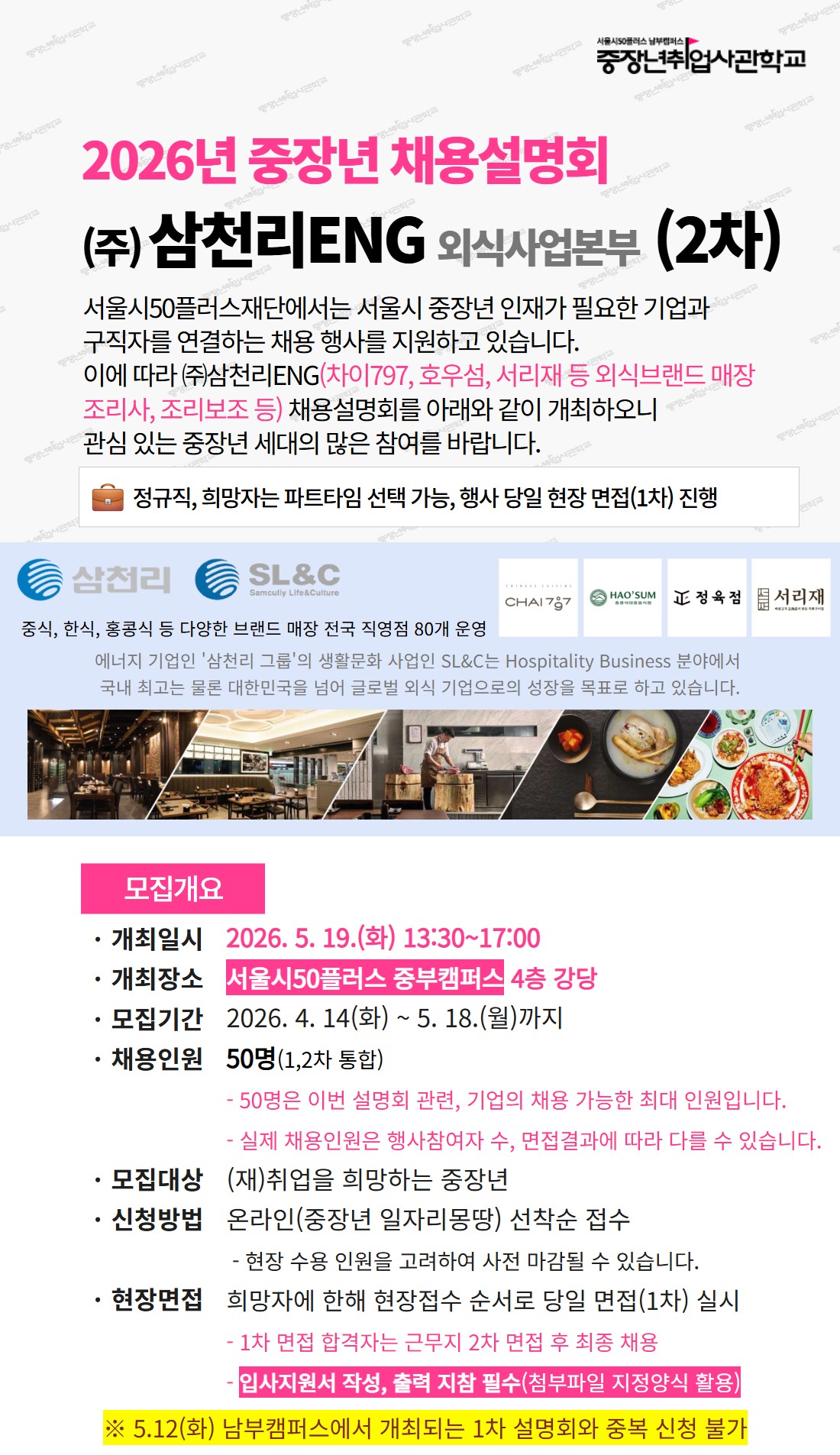 정규직 50명. 외식사업본부 브랜드 매장 직원 채용을 위한 설명회를 개최합니다.