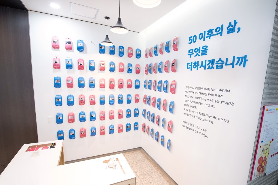 1층에 들어오면 가장 먼저 눈을 사로잡는 공간이 있다. “50 이후의 삶, 무엇을 더하시겠습니까"라는 글귀와 벽에 가득 붙은 카드들.