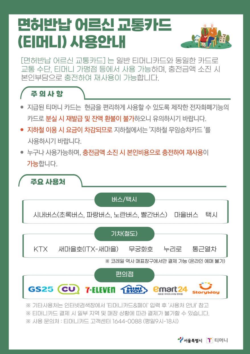 · 면허반납 어르신 교통카드는 버스, 택시, 기차 등 교통수단과 편의점 등 티머니 가맹점에서도 사용하실 수 있습니다.