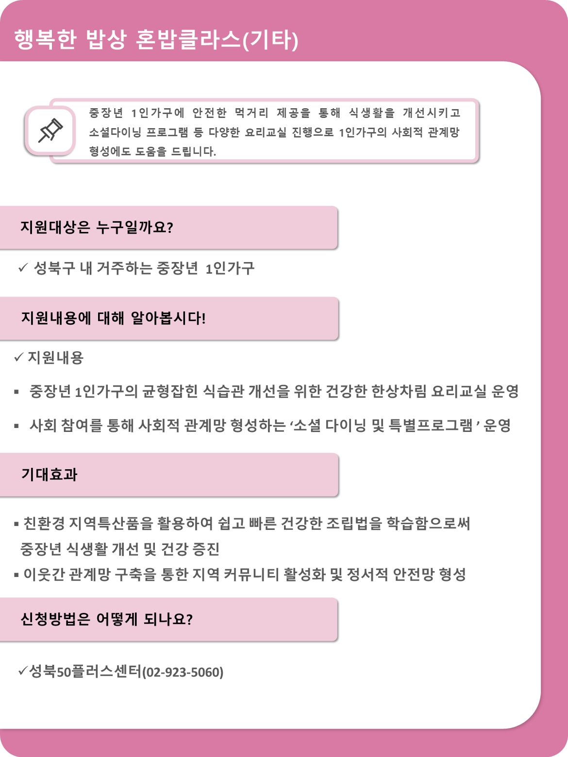 중장년 1인가구의 균형잡힌 식습관 개선을 위한 건강한 한상차림 요리교실 운영, 사회 참여를 통해 사회적 관계망을 형성하는 '소셜 다이닝 및 특별프로그램' 운영