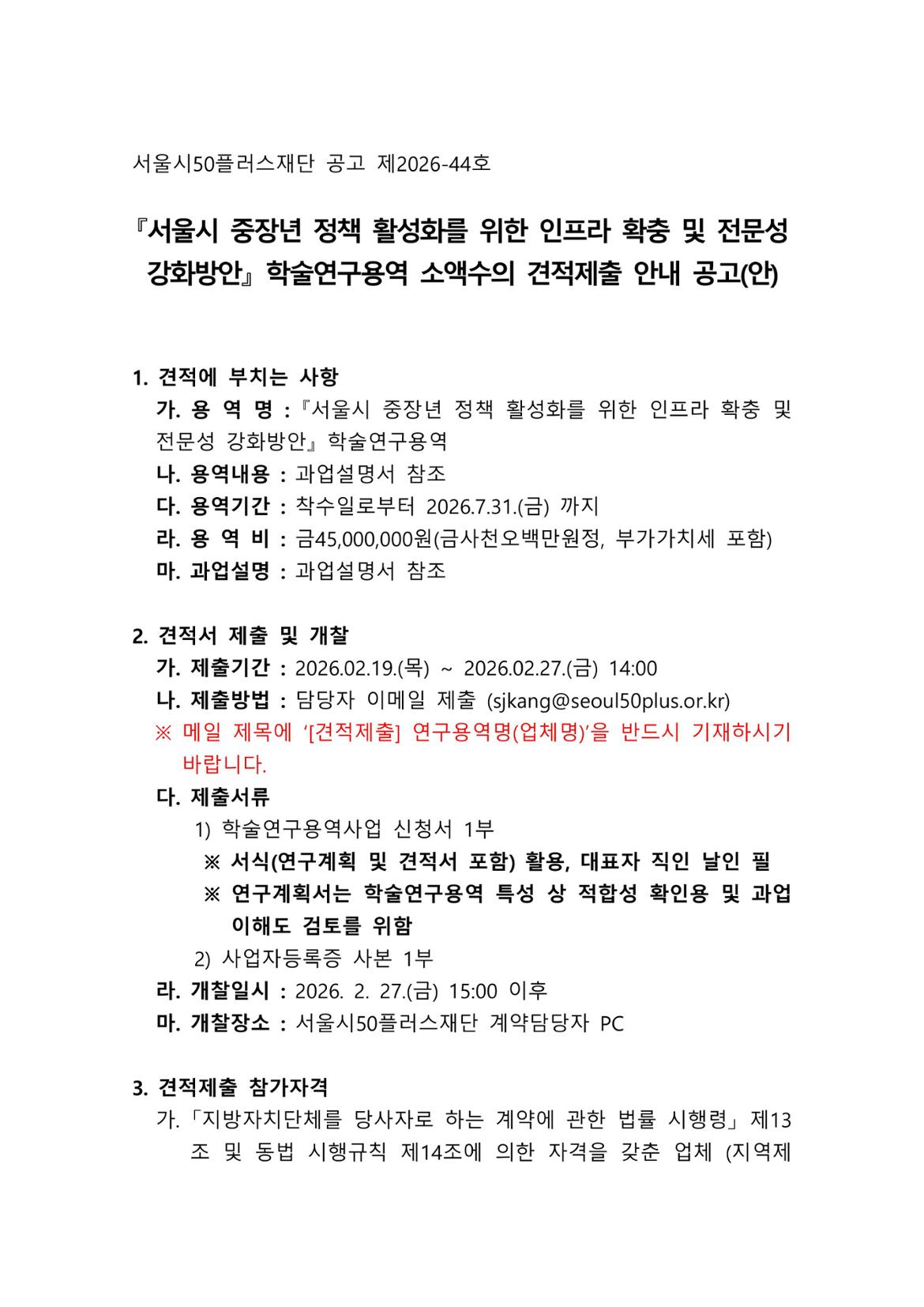 [입찰공고] 『서울시 중장년 정책 활성화를 위한 인프라 확충 및 전문성 강화방안』 학술연구용역