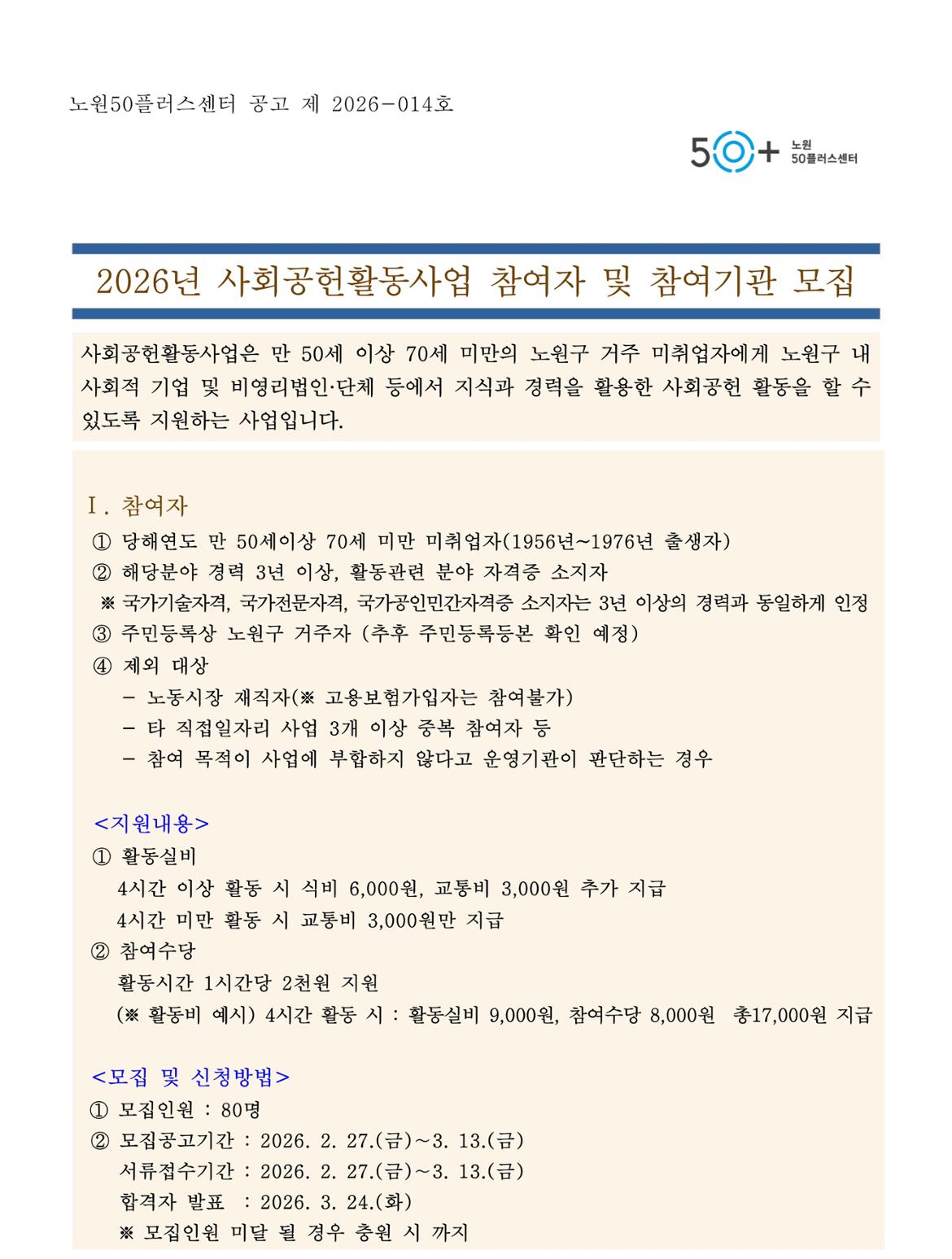 서울시 노원센터 | 2026년 사회공헌활동사업 참여자 및 참여기관 모집(~3/13까지)