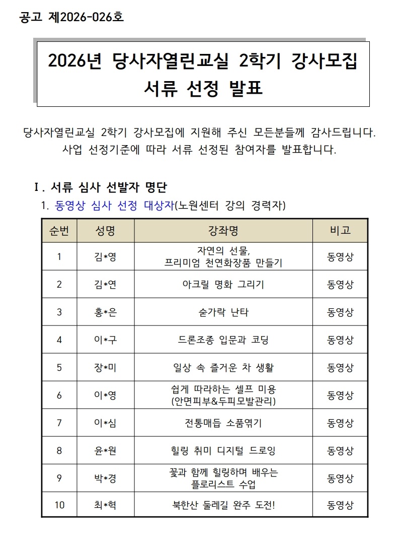 2026년 당사자열린교실 2학기 강사 서류심사 선정 발표